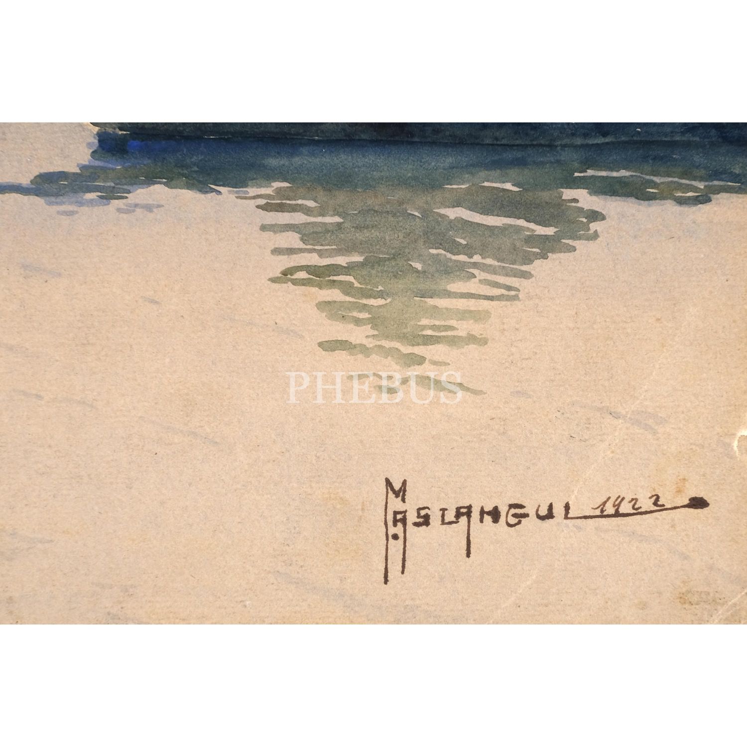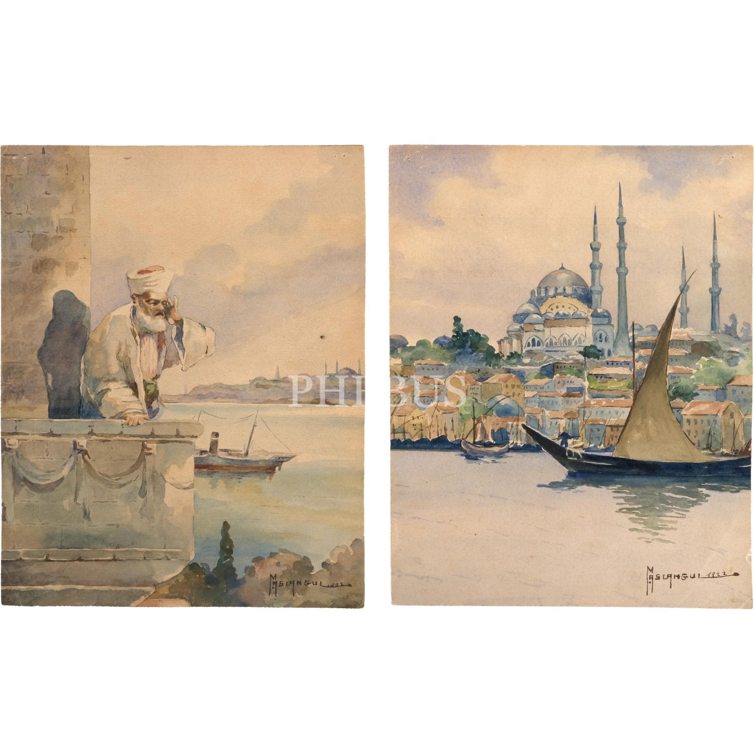 M. Aslangül imzalı, karton üzerine suluboya 2 adet orijinal çizim, 1922, 21x28 cm...