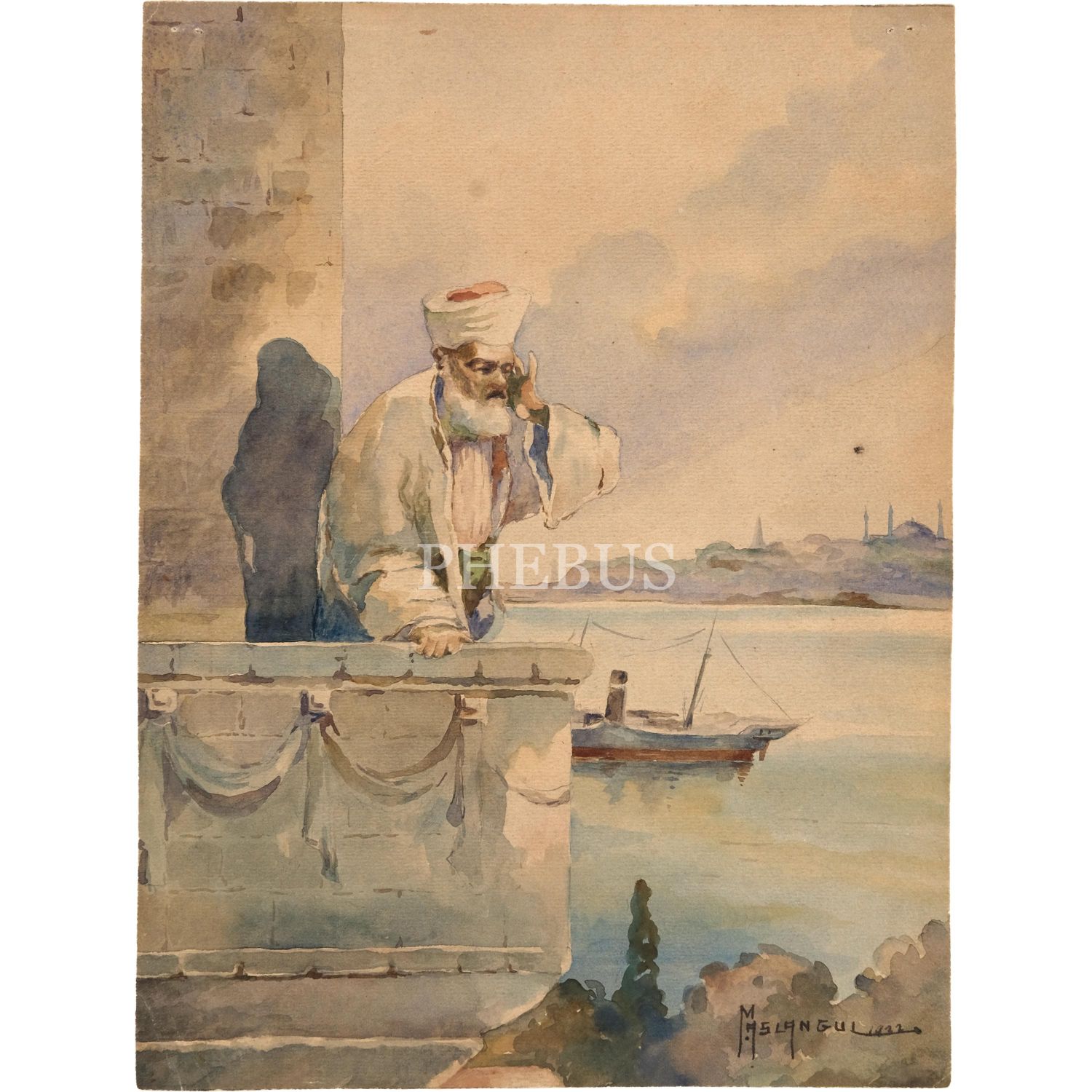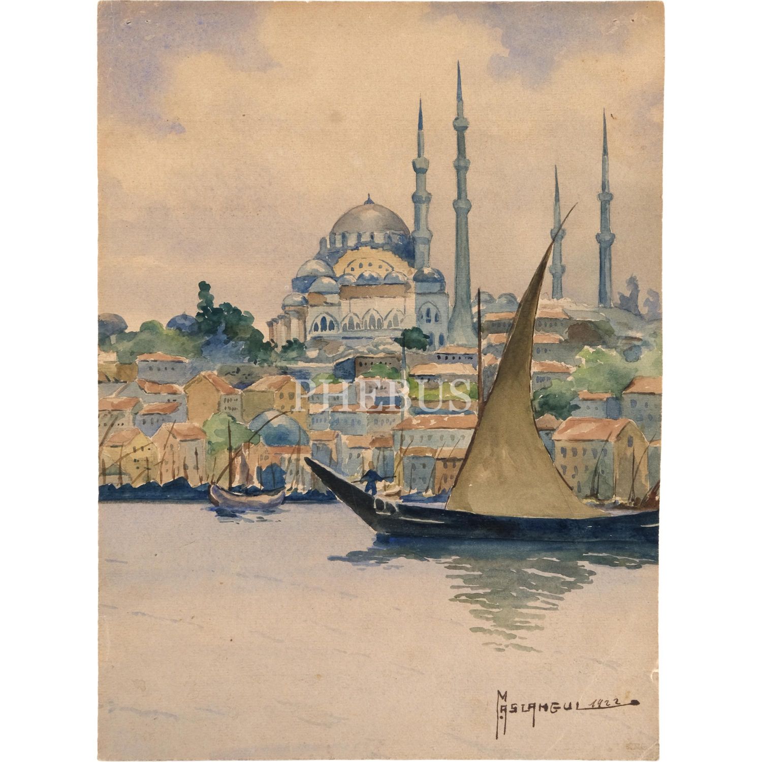 Çizimlerden birinde Haliç´ten Süleymaniye Camii´nin görülmekte, bir diğerinde minarede ezan okuyan müezzin görülmektedir.