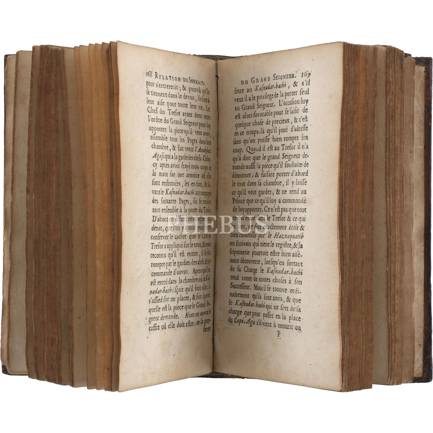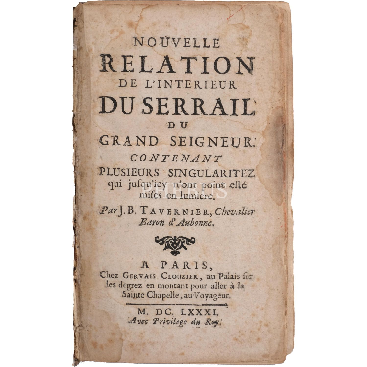 yolculuğuna çıkan, iki kez de İstanbul’a gelen Tavernier, Doğu üzerine defalarca tekrar baskısı yapılmış, en güzel seyahatnameleri kaleme almıştır. Müzayedemizde sunduğumuz bu kitap, bu ünlü seyyahın basılan ilk eseri olma özelliğini taşır.