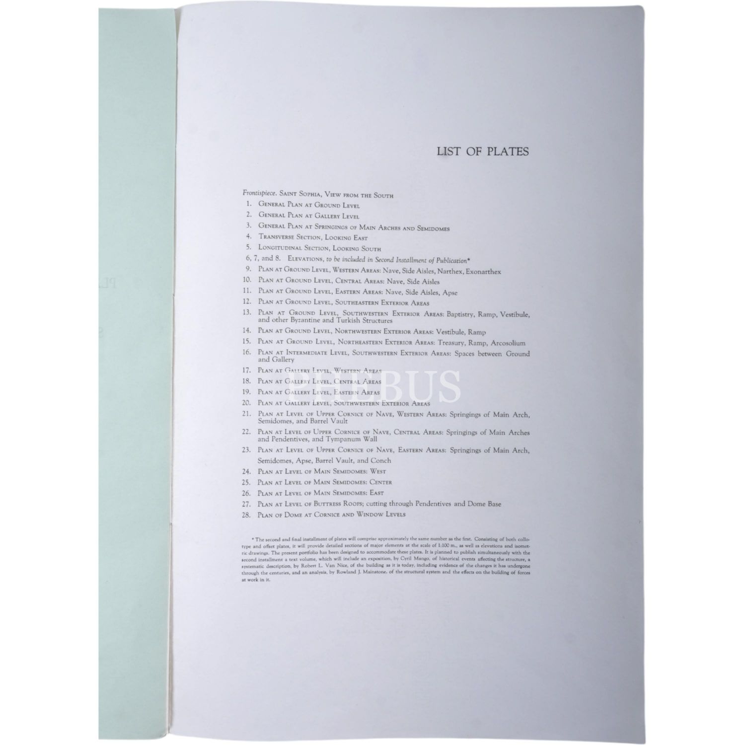 Sanat tarihçisi Robert L. van Nice tarafından 1931 senesinde başlanıp 30 senede tamamlanan, Ayasofya'nın rölövelerini içeren 25 adet levhadan oluşan albümdür. Robert L. van Nice, otuz yıllık süre içerisinde bütün mesaisini bu çalışmaya ayırmış ve çok detaylı bir çizim ortaya koymuştur, öyle ki taşlardaki kırıklar ve çatlakları dahi göstermiştir. Satışa sunduğumuz albüm 25 adet levhadan ayrı numaralandırılmamış Ayasofya Cami'nin dışardan göründüğü büyük boy bir resmini içermektedir. Albüm numaralandırılışında 28 adet levhadan ibaret görünse de, yayımlandığı dönemde 5, 6 ve 7 numaralı levhaların ikinci fasikülünde verilecekleri ilan edilmiştir.
