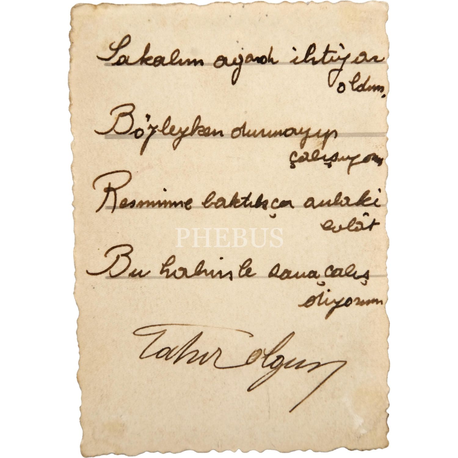 Fotoğrafın arka yüzünde "Sakalım ağardı ihtiyar oldum / Böyleyken oturmayıp çalışıyorum, / Resmime baktıkça anla ki evlat, / Bu halimle sana çalış diyorum" dizeleri ve imzası yer almaktadır.