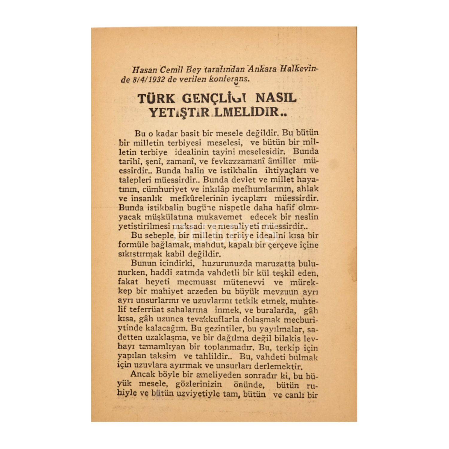 (KONFERANS) TÜRK GENÇLİĞİ NASIL YETİŞTİRİLMELİDİR?, Hasan Cemil, 32 sayfa, 13x19 cm...