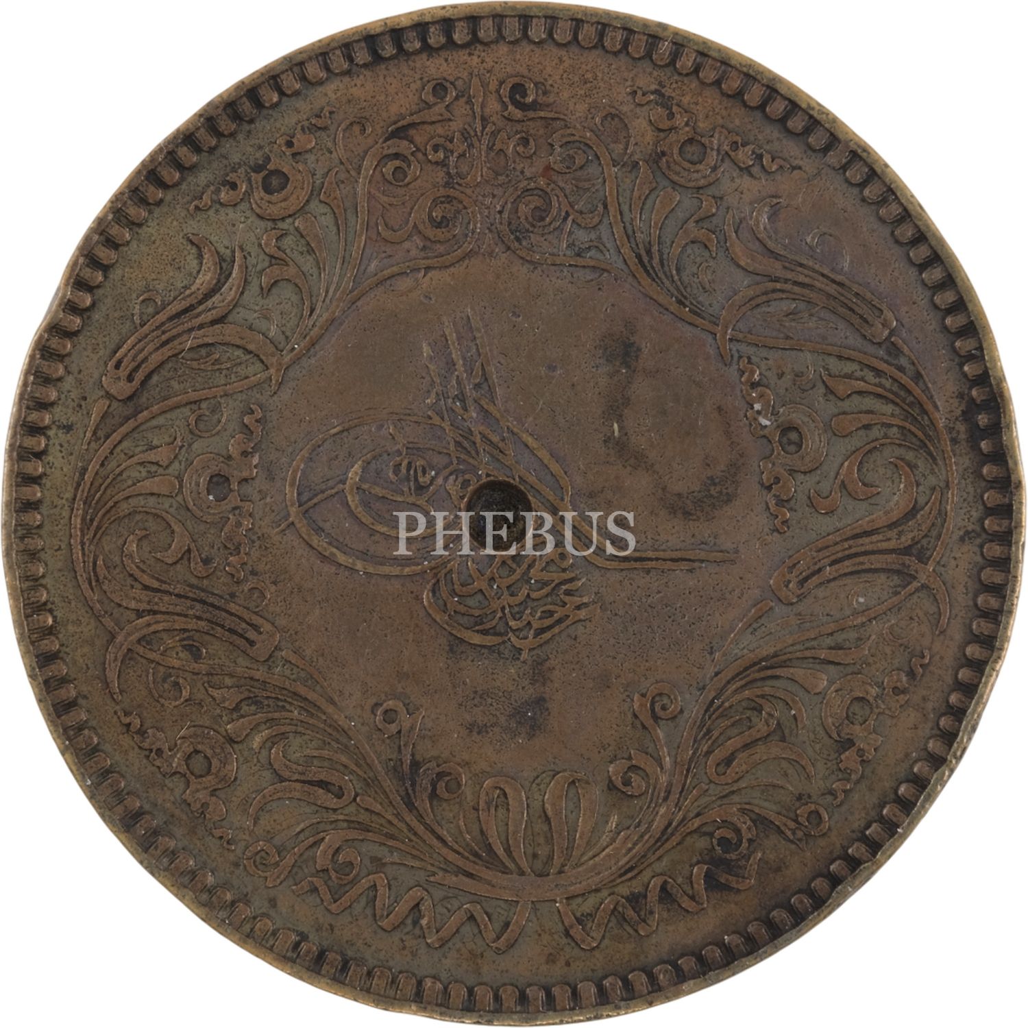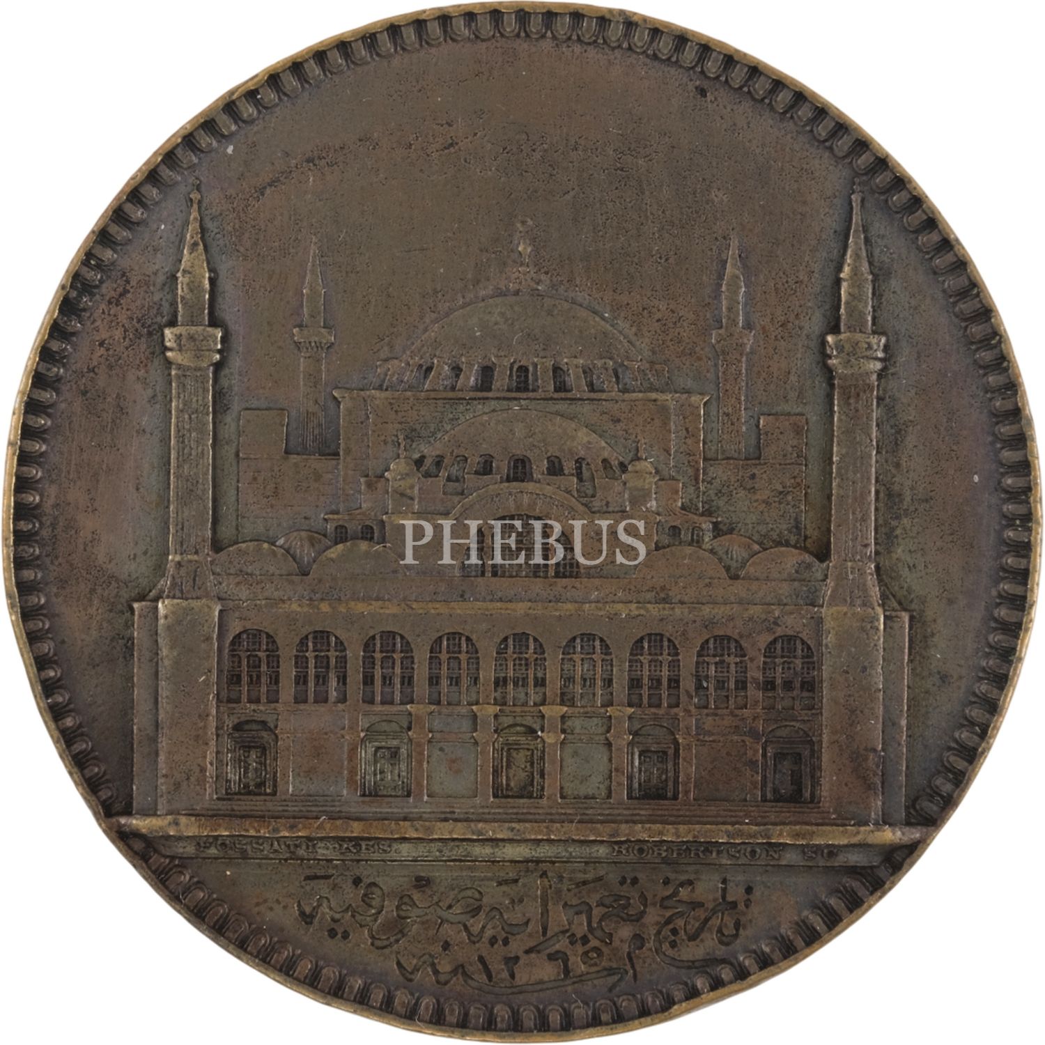 TUĞRA KISMINDA DELME İZİ VAR Ön yüzünde Abdülmecit Han´ın tuğrası ve arka yüzünde ise Ayasofya Camii şerifi ve altında Osmanlıca ´Tarih-i Tamir-i Ayasofya sene 1265 (1847)´ yazılı Abdülmecit Han´ın emri ile Mimar Gaspar Fosatti nezaretinde 2 yılda tamamlan ve büyük bir törenle ibadete yeniden açılan Ayasofya Camii anısına bastırılmış ve devletin ileri gelenlerine hatıra olarak verilmiş.