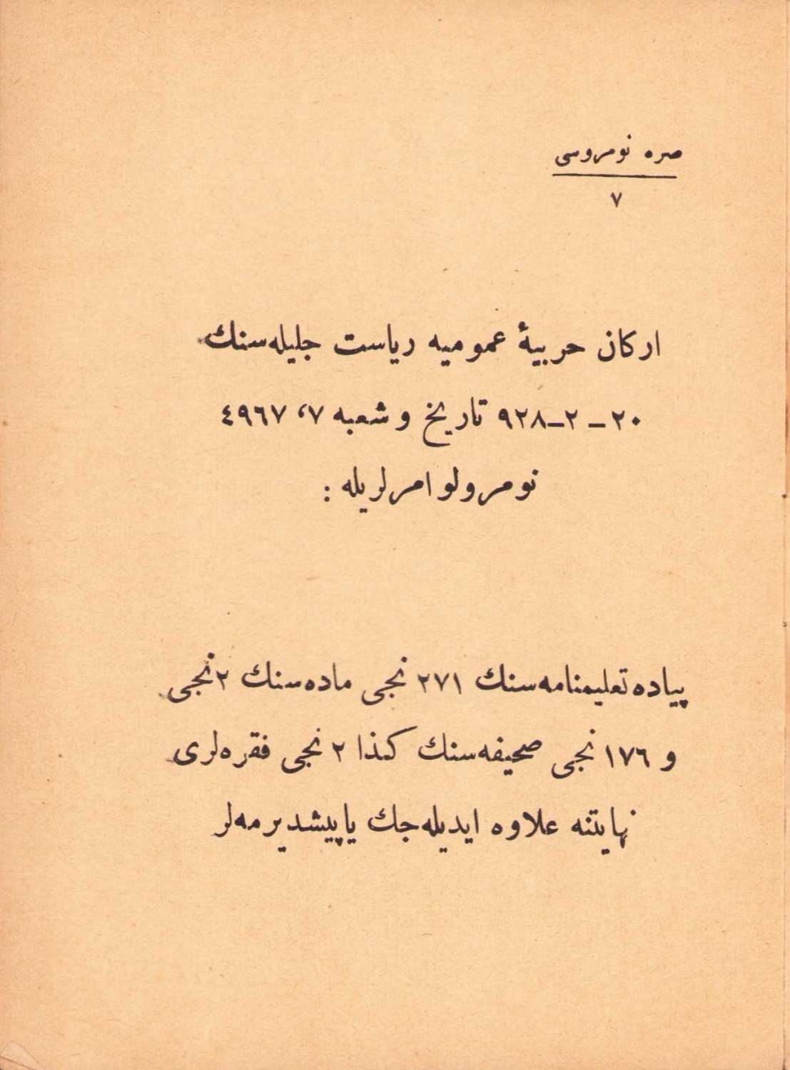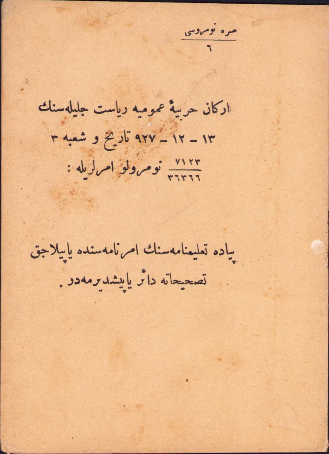Osmalıca Erkan-ı Harbiye-i Umumiye Riyaset-i Celilesinin 1927 tarih ve 3. şube emriyle Piyade Talimnamesinin emirnamesinde yapılacak tashihata yapıştırmadır. 5 sayfa, 10x14 cm