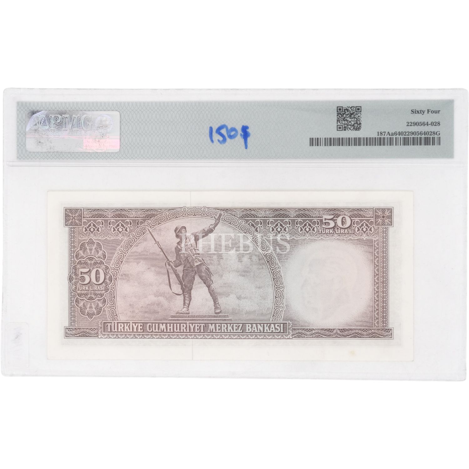 5. EMİSYON 7. TERTİP 50 LİRA SERİ U62 PMG SERTİFİKALI 64 PUAN