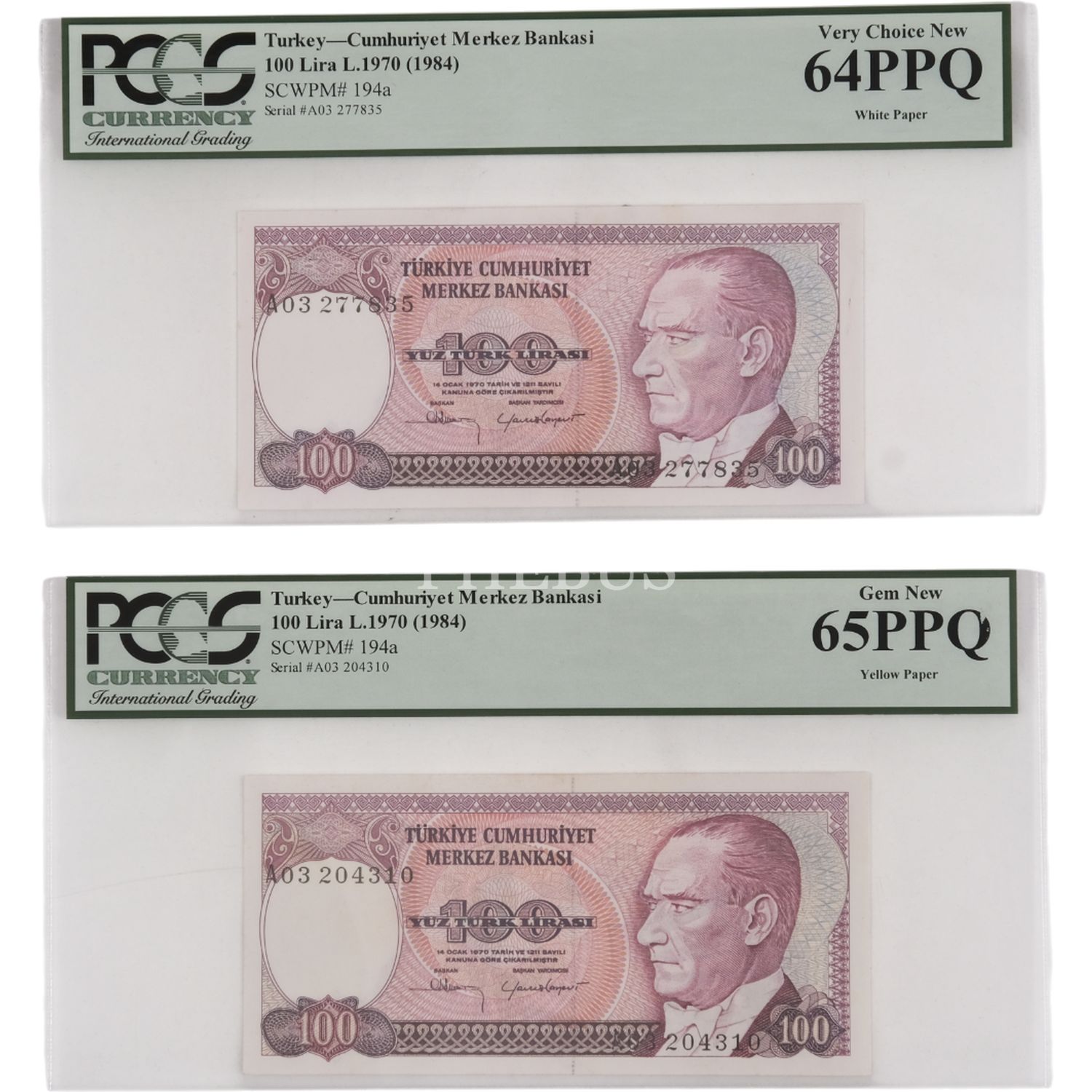 7. EMİSYON 100 LİRA SERİ A03 PCGS SERTİFİKALI 64 PPQ - 65 PPQ, SARI - BEYAZ KAĞIT TAKIM