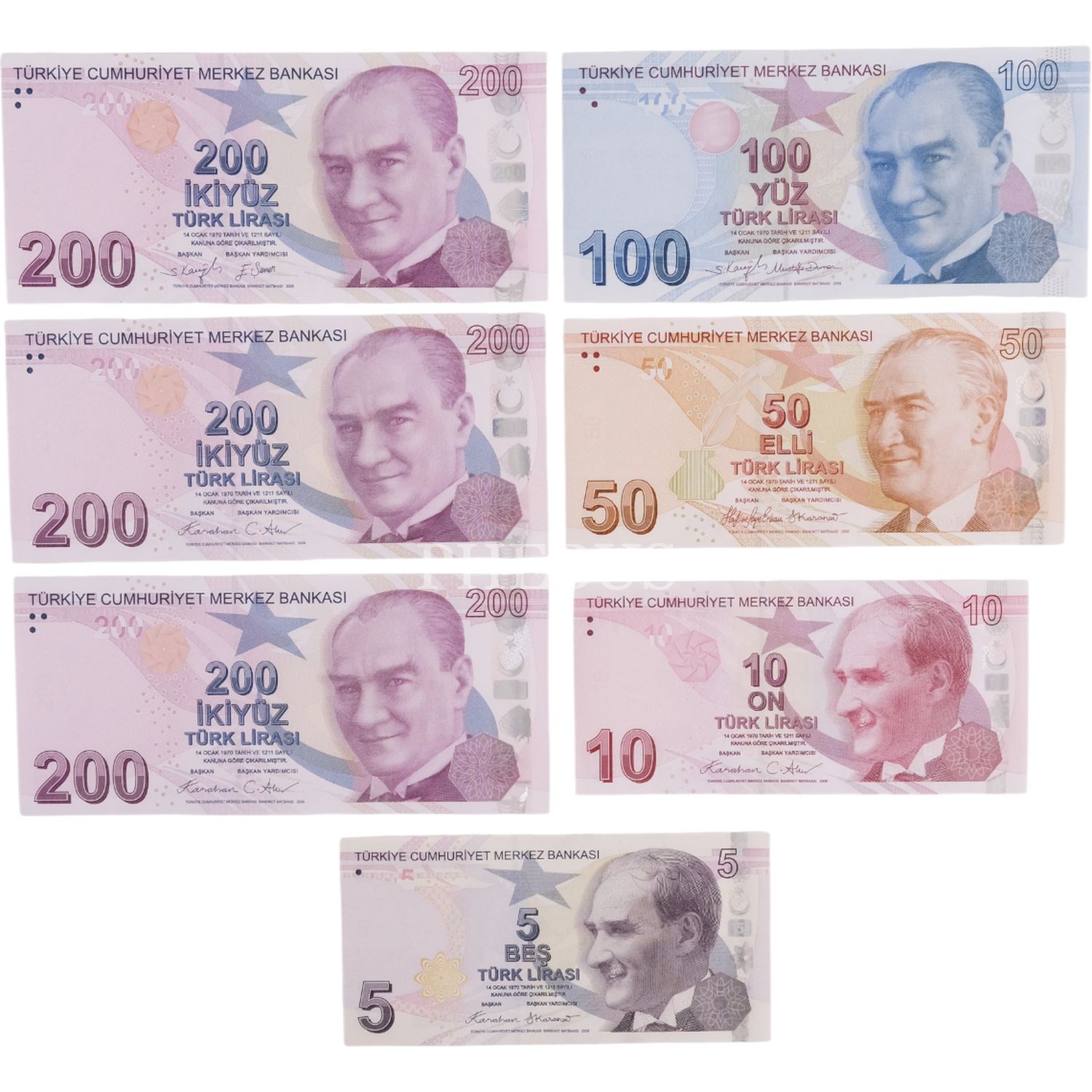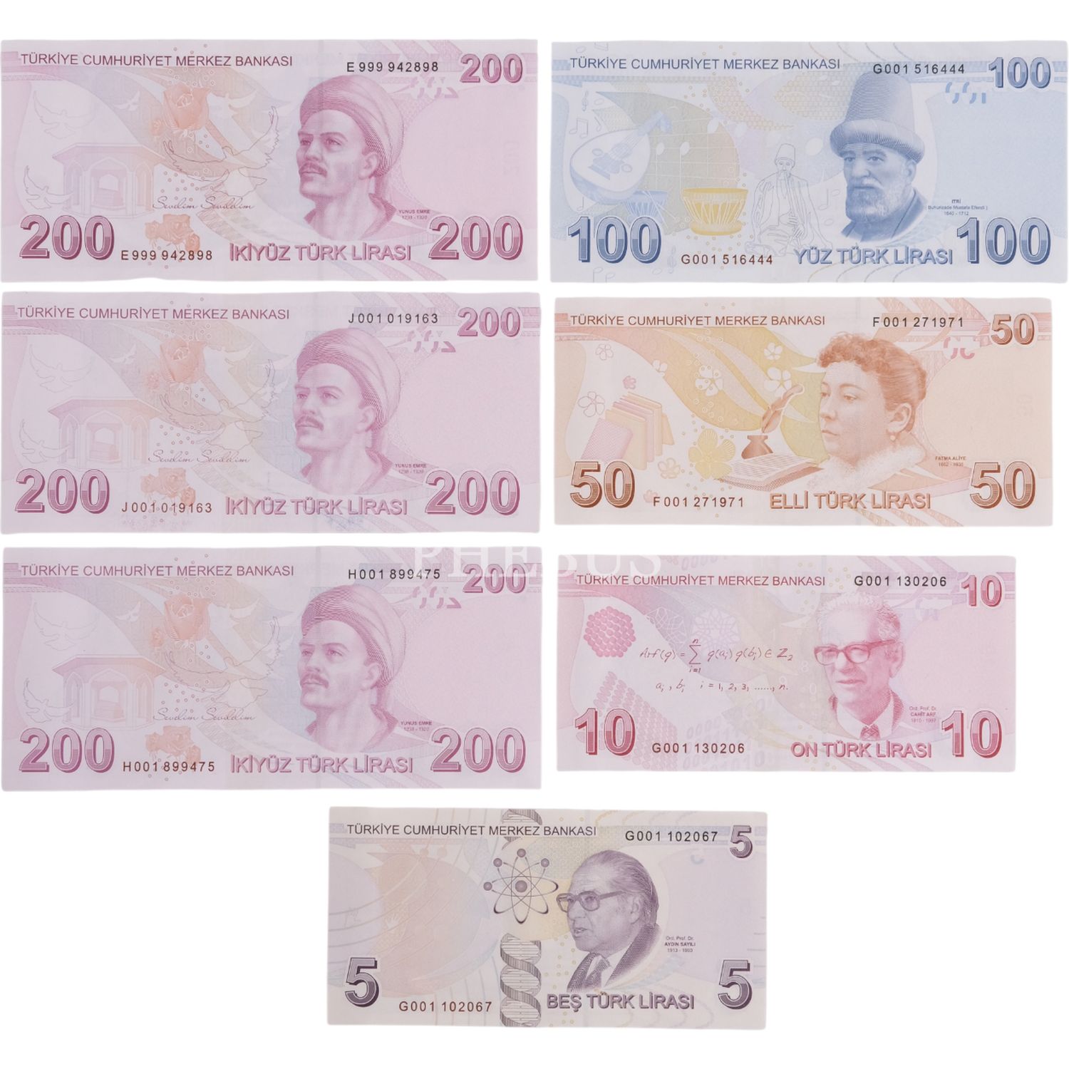 9. EMİSYON 5 LİRA SERİ G001 - 10 LİRA SERİ G001 - 50 LİRA SERİ F001 - 100 LİRA SERİ G001 - 200 LİRA SERİ H001, J001, E999 ÇİL