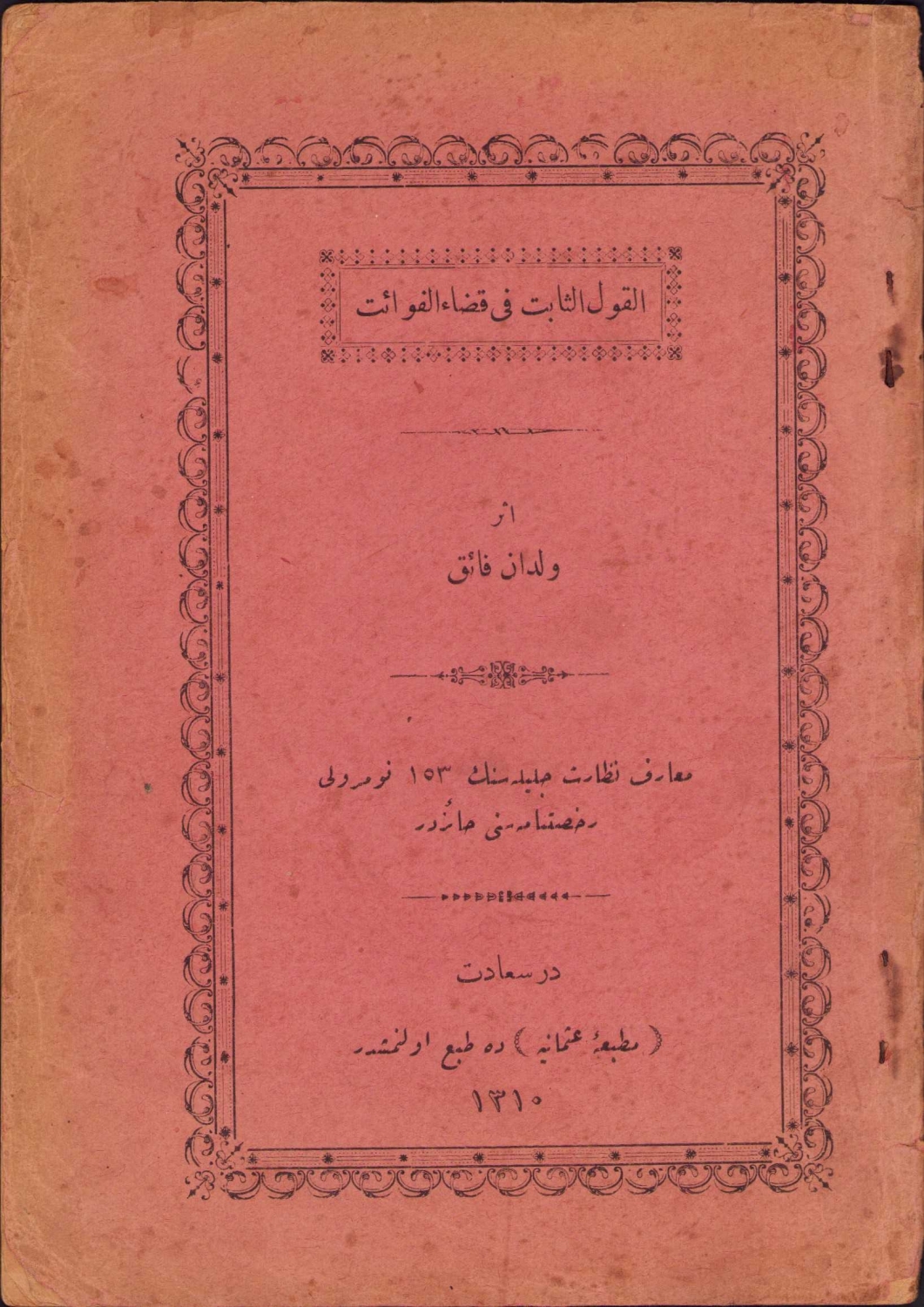 Osmanlıca El-Kavlu's-sabit fi Kazai'l-fevaid, Vildan Faif, Matbaa-i Osmaniye, Dersaadet, 1310, 46 sayfa, 13x19 cm, ÖZEGE;10450
