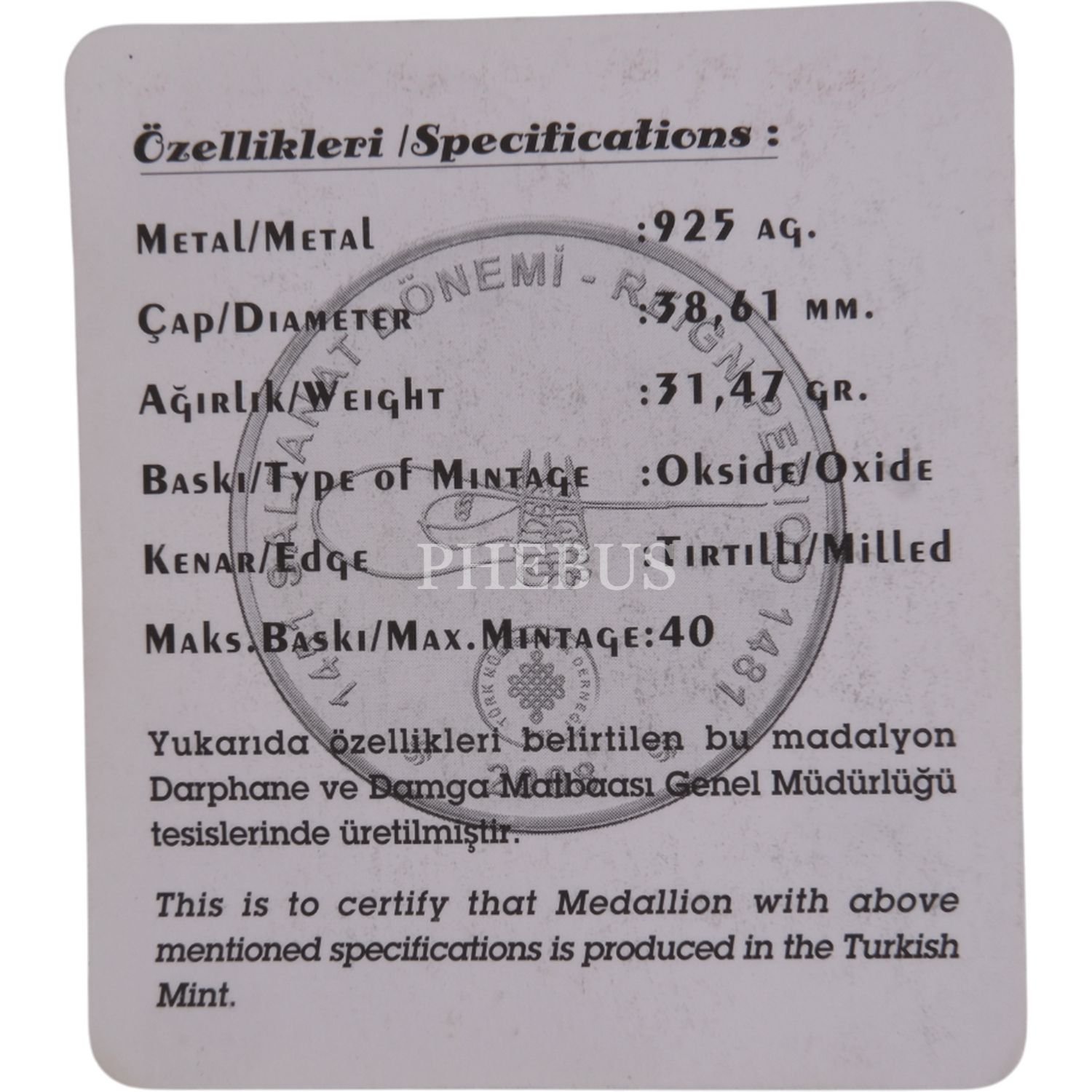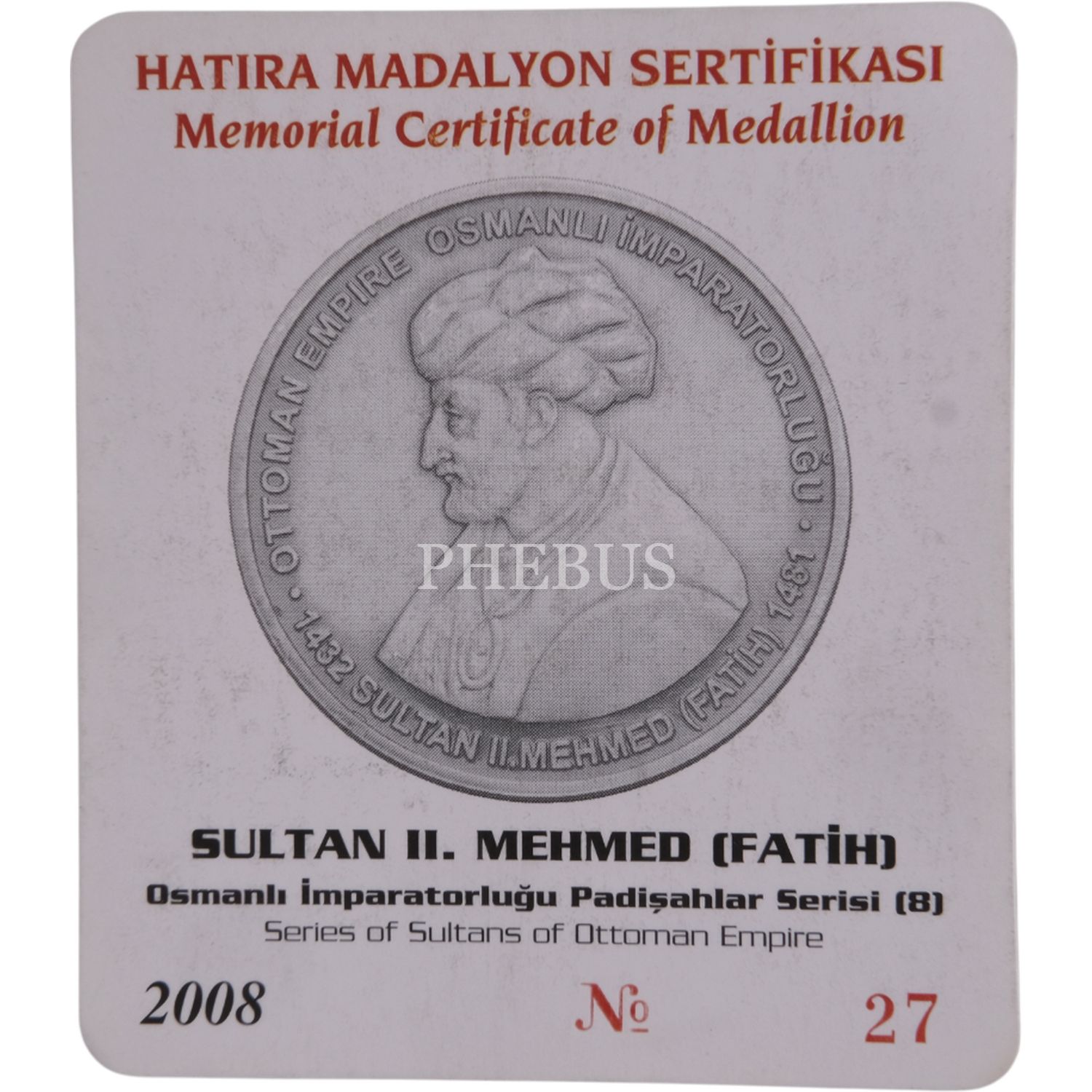 2008 SULTAN II. MEHMED (FATİH) GÜMÜŞ HATIRA SERTİFİKALI