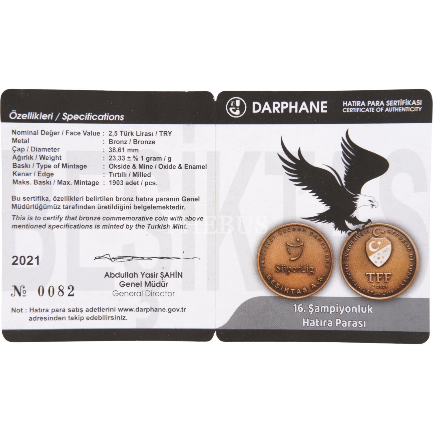 2021 BEŞİKTAŞ 16. ŞAMPİYONLUK HATIRA PARASI BRONZ SERTİFİKALI