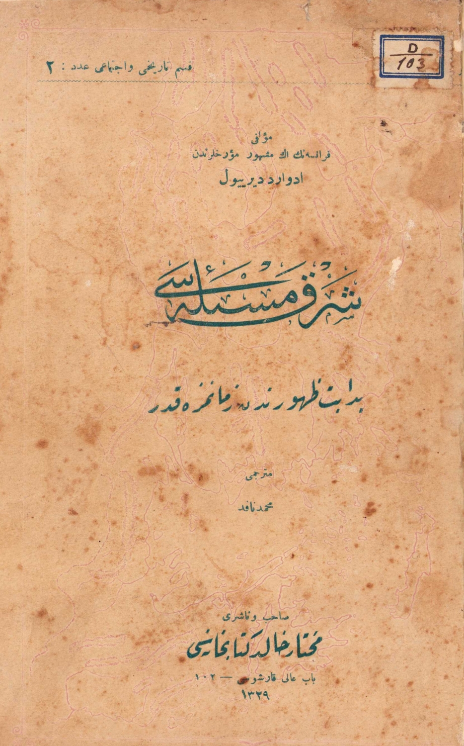 Osmanlıca Şark Meselesi Bidayet-i Zuhurundan Zamanımıza Kadar, Eduart Driault, çev., Mehmet Nafiz, Tanin Matbaası, 1328, Muhtar Halit Kitaphanesi, İstanbul, son sayfa ciltten kopuk, 509 sayfa, 16x24 cm, ÖZEGE; 18613