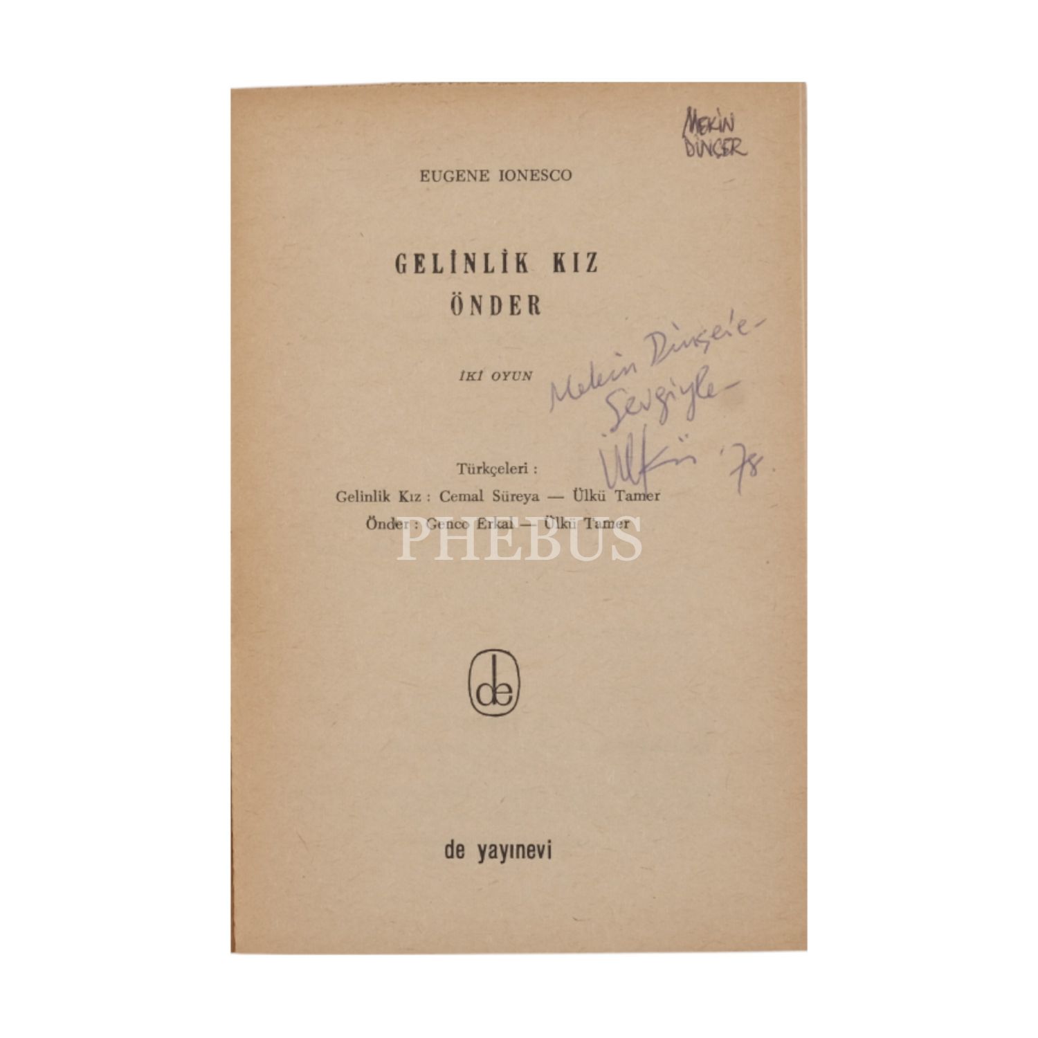 GELİNLİK KIZ - ÖNDER, Eugene Ionesco, (çevirenler: Cemal Süreyya, Ülkü Tamer, Genco Erkal), 1964, De Yayınevi, 30 sayfa, 12x17 cm...