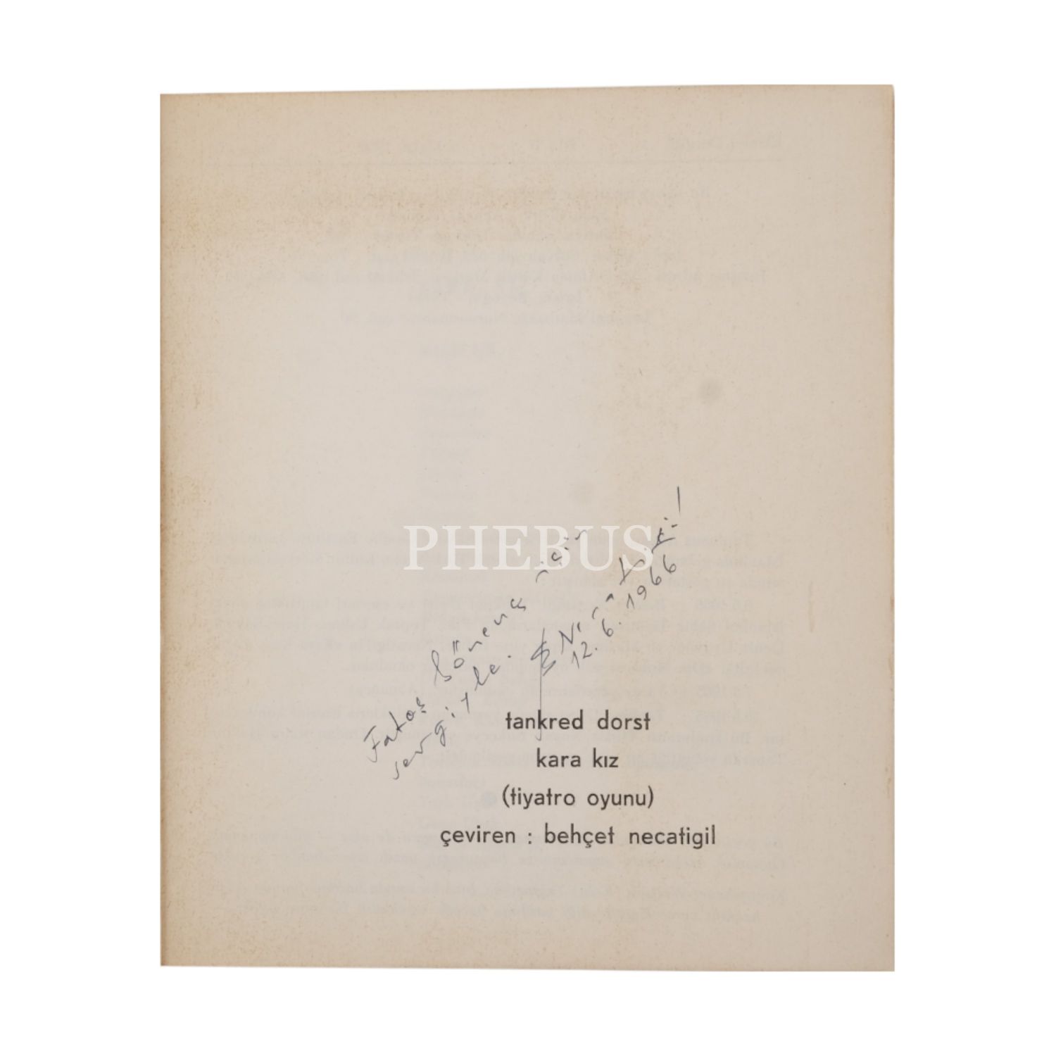 1965 yılında Goethe Enstitüsü´nün yardımıyla İstanbul´a gelen ve Behçet Necatigil ile birlikte Türk-Alman Kültür Merkezi´nde çeşitli programlar düzenleyen Alman oyun yazarı Tankred Dorst´un, "Kara Kız" isimli tiyatro oyununun Behçet Necatigil tarafından yapılan Türkçe çevirisi... "Fatoş Gönenç için sevgiyle." ithafıyla, 12 Mayıs 1966 tarihinde imzalanmıştır.