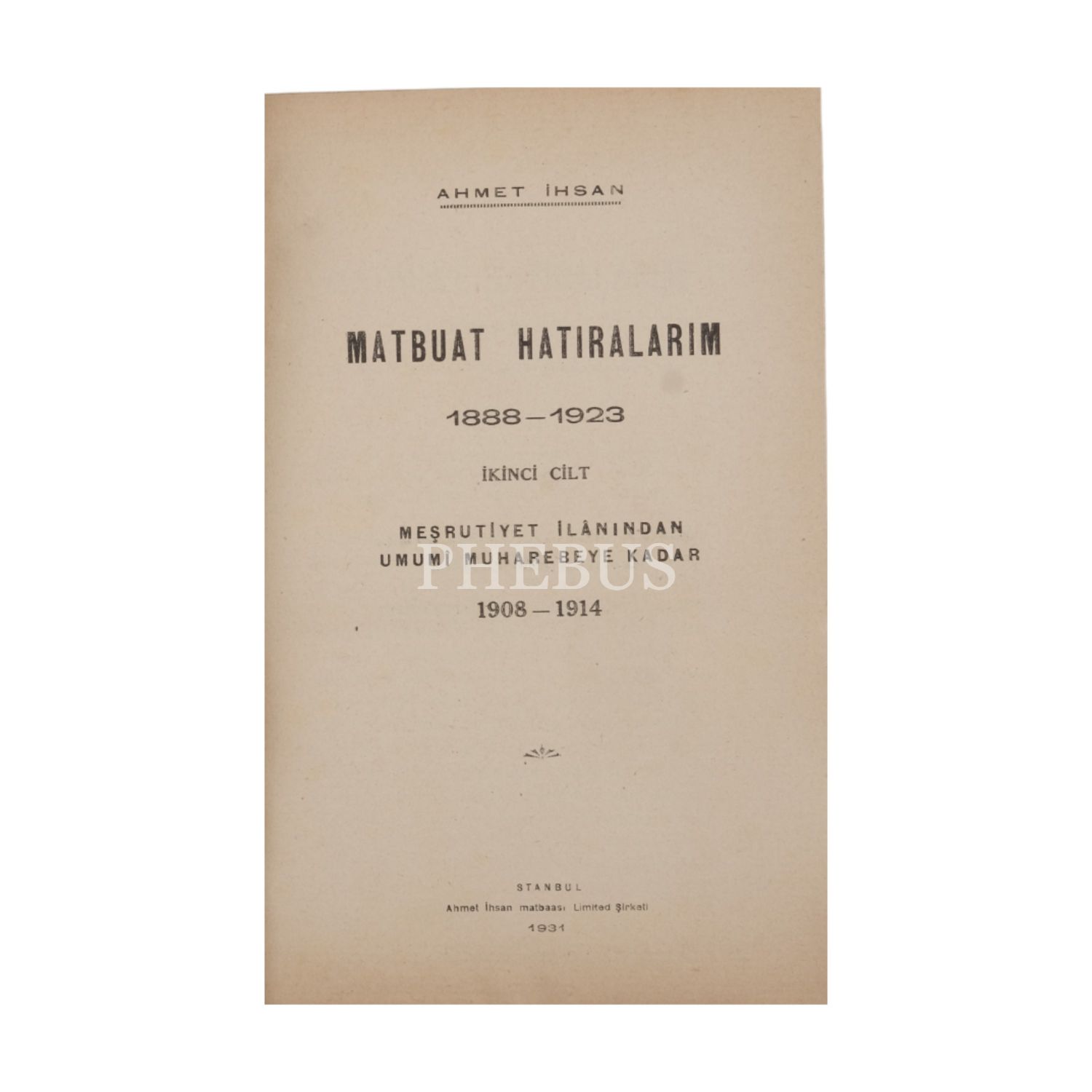 MATBUAT HATIRALARIM 1888 - 1923 (İkinci Cilt: Meşrutiyet İlânından Umumî Muharebeye Kadar 1908 - 1914), Ahmet İhsan, 1931, Ahmet İhsan Matbaası, 173 sayfa, 14x21 cm...