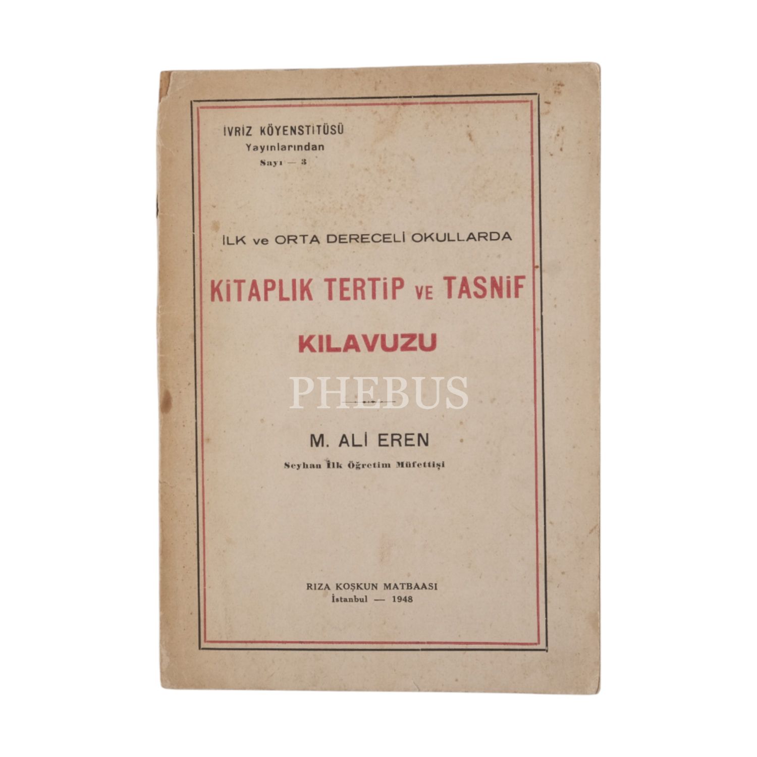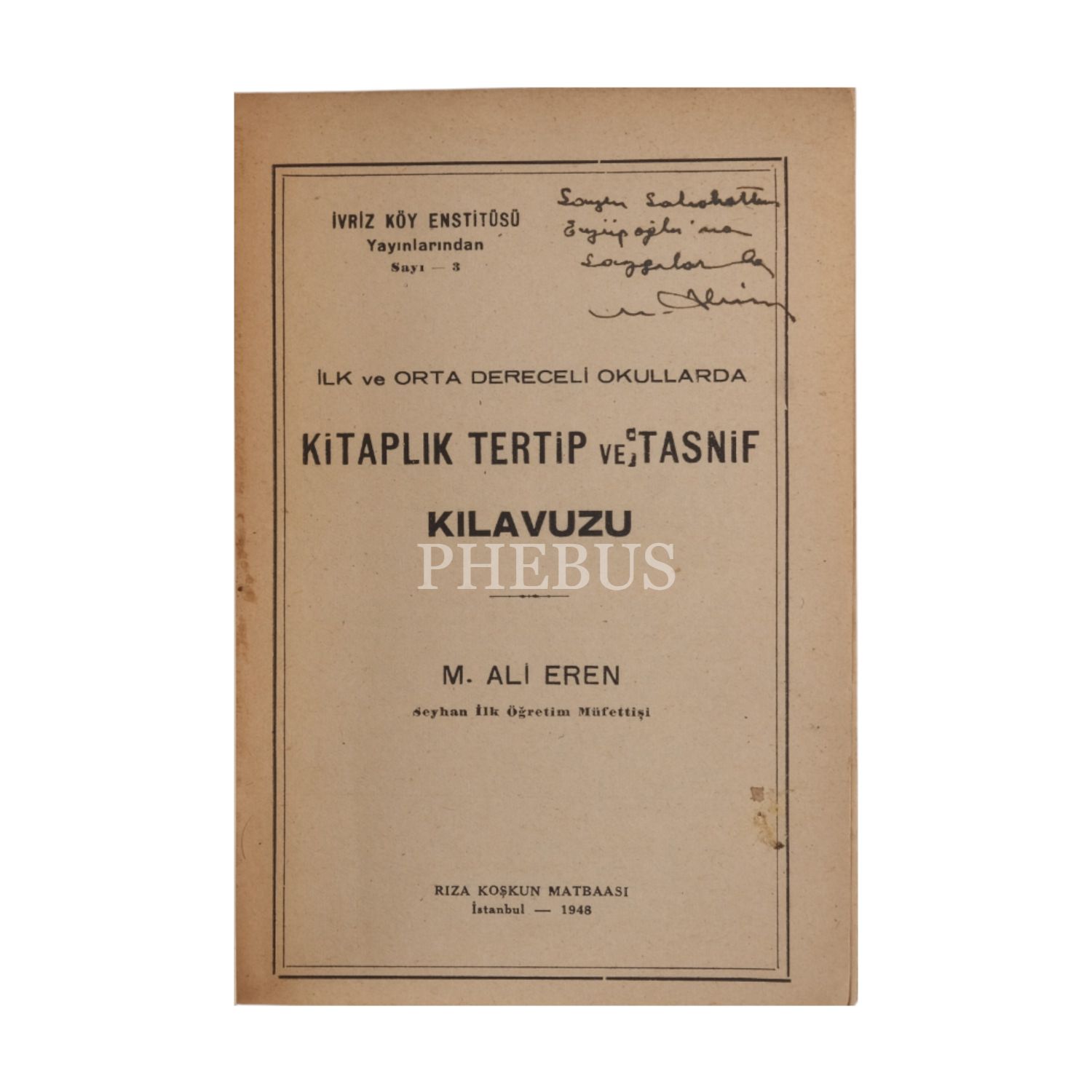 İLK VE ORTA DERECELİ OKULLARDA KİTAPLIK TERTİP VE TASNİF KILAVUZU, M. Ali Eren, 1948, Rıza Koşkun Matbaası, 80 sayfa, 14x21 cm...