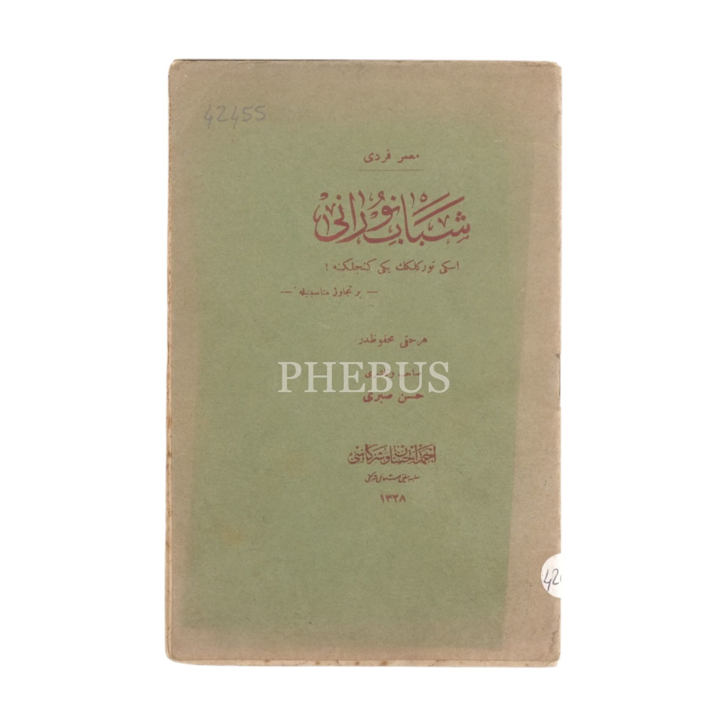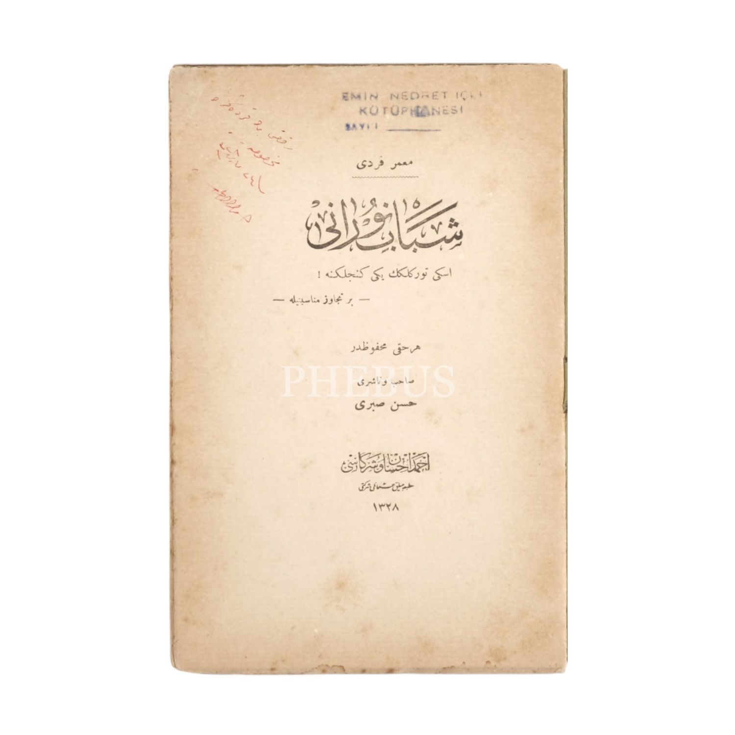 ŞEBAB-I NURANİ, Muammer Ferdi, 1328, Ahmed İhsan ve Şürekası Matbaacılık Osmanlı Şirketi, 16 sayfa, 14x20 cm...