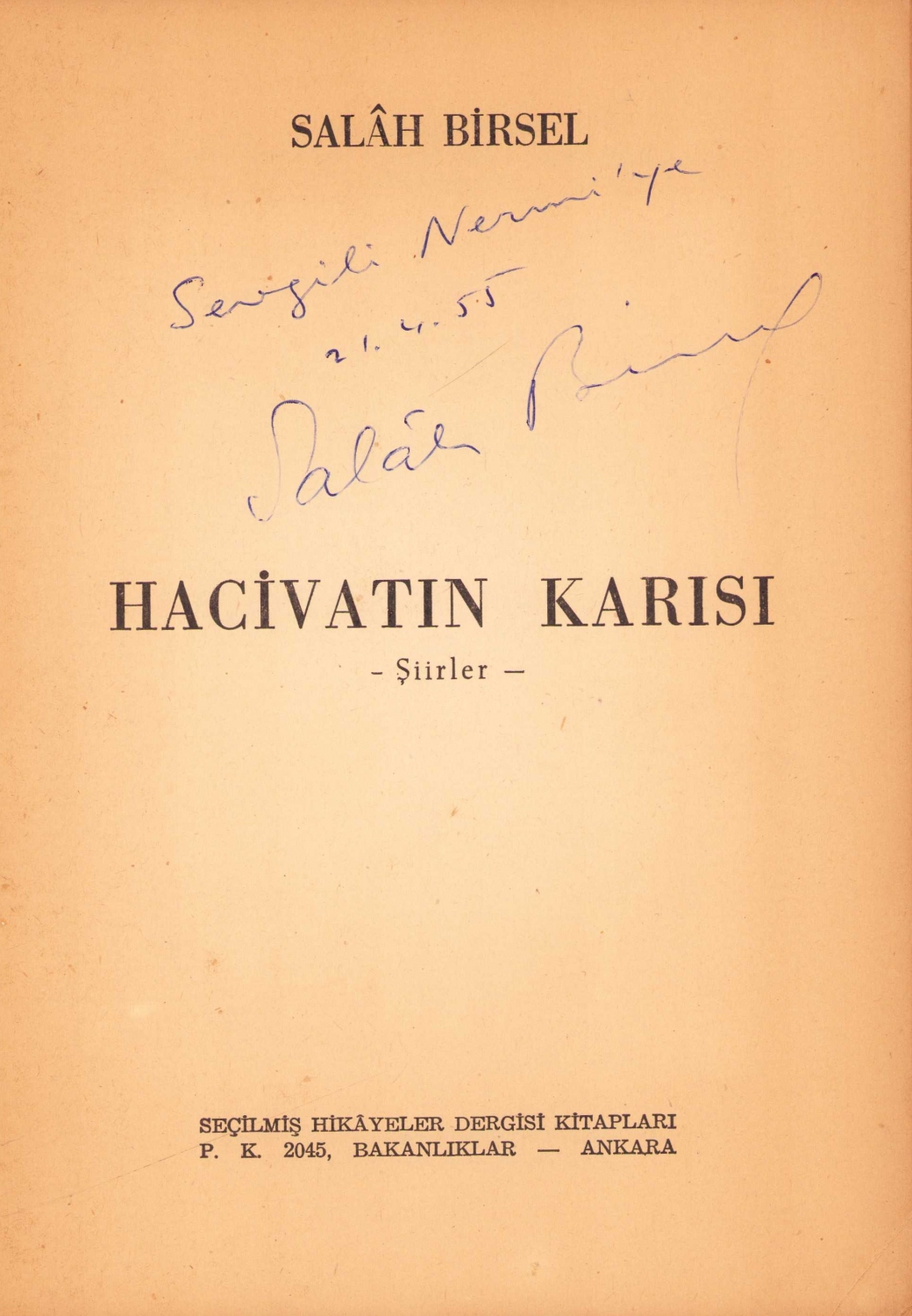 Hacivatın Karısı, Salah Birsel, Ankara, 1955, Salah Birsel'den Nermi Uygur'a ithaflı imzalı, 36 sayfa, 16x24 cm