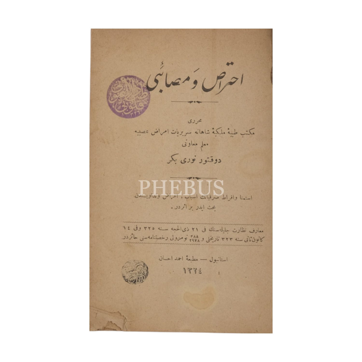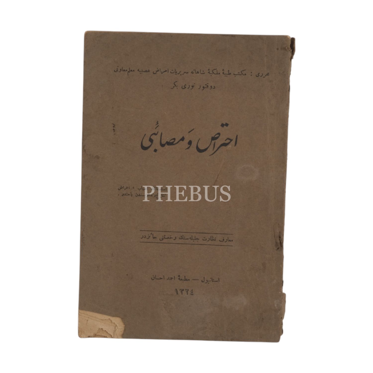 İHTİRAS VE MESAİBİ, Nuri Bekir, 1324, Matbaa-i Ahmed İhsan, 64 sayfa, 12x18 cm...
