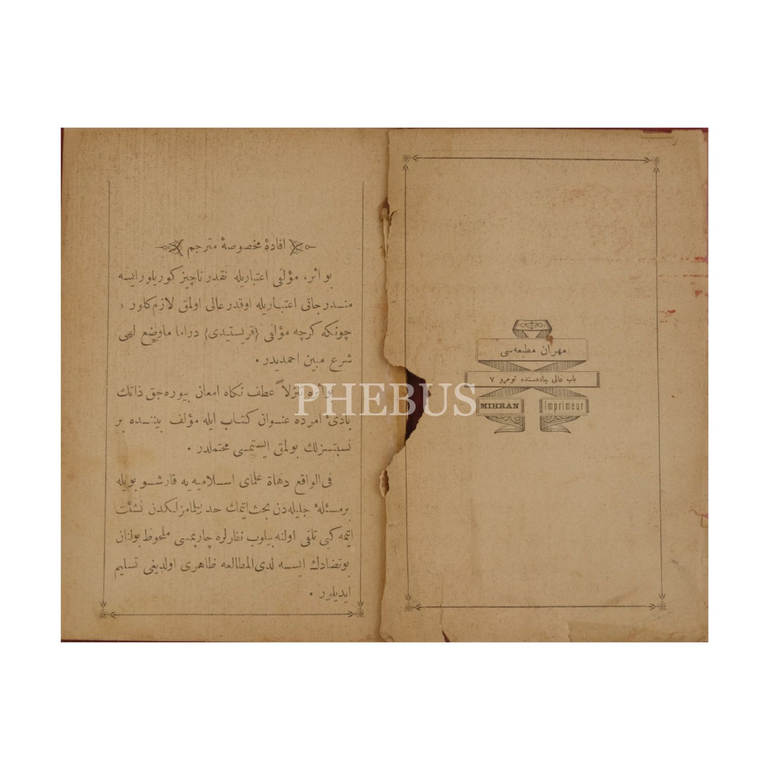 ŞERÎAT-İ GARRÂ-YI İSLÂMİYEYE DÂİR MÜTÂLAÂT-I SIHHİYE, Dr. A. Kristidi, çeviren: Dr. Bafralı Yanko, 1305, Mihran Matbaası, 55 sayfa, 12x18 cm...