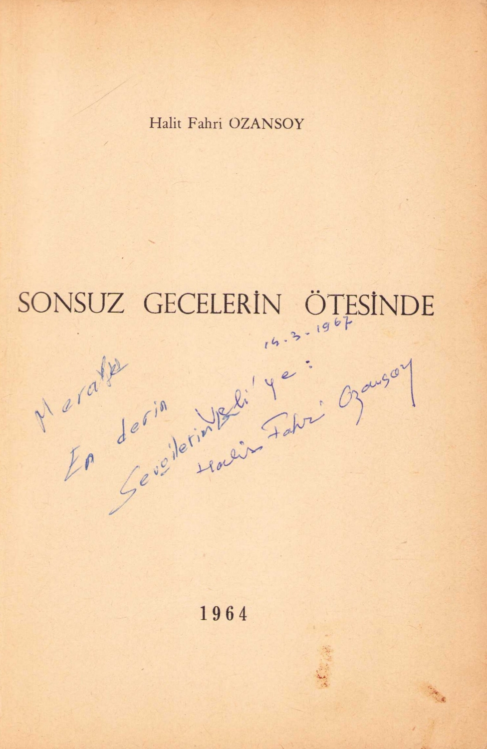 Sonsuz Gecelerin Ötesinde, Halit Fahri Ozansoy, Baha Matbaası, İstanbul, 1964, yazarından ithaflı imzalı, sırtın bir kenarı kopuk, arka kapak kopuk, 91 sayfa, 14x19 cm