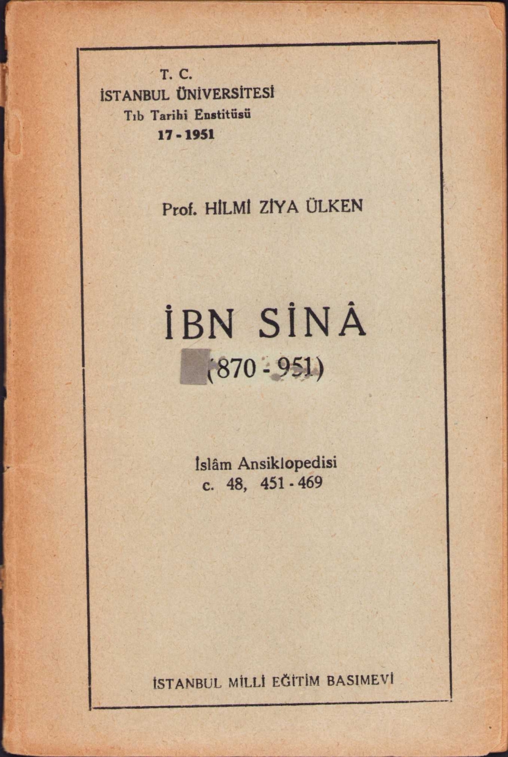 İstanbul Üniversitesi Tıb Tarihi Enstitüs: 17, İbn Sina, Prof. Hilmi Ziya Ülken, İstanbul Milli Eğitim Basımevi, c. 48, 53 sayfa, 10x16 cm