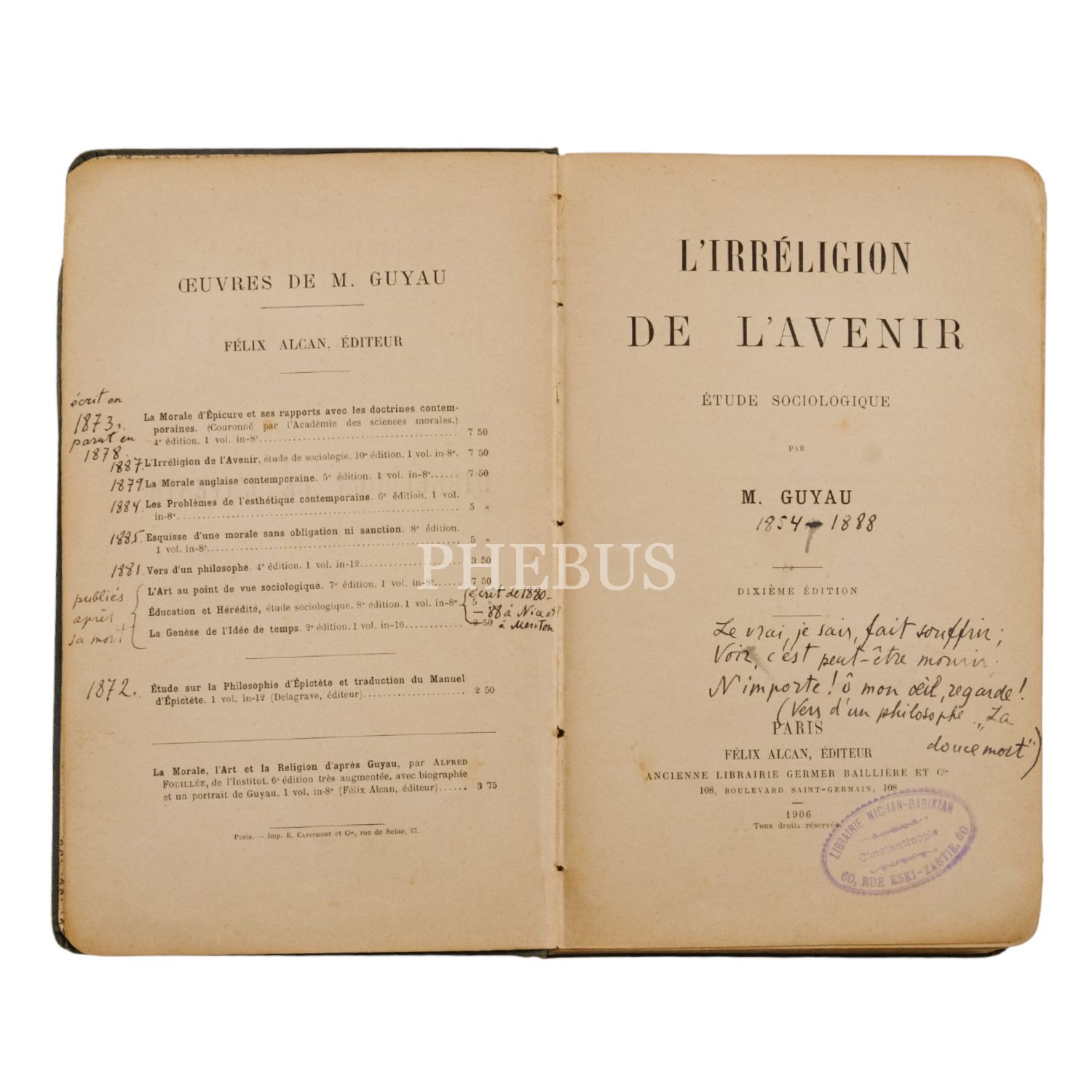 L´IRRELIGION DE L´AVENIR, M. Guyau, 1906, Felix Alcan (Paris), 479 sayfa, 14x22 cm..