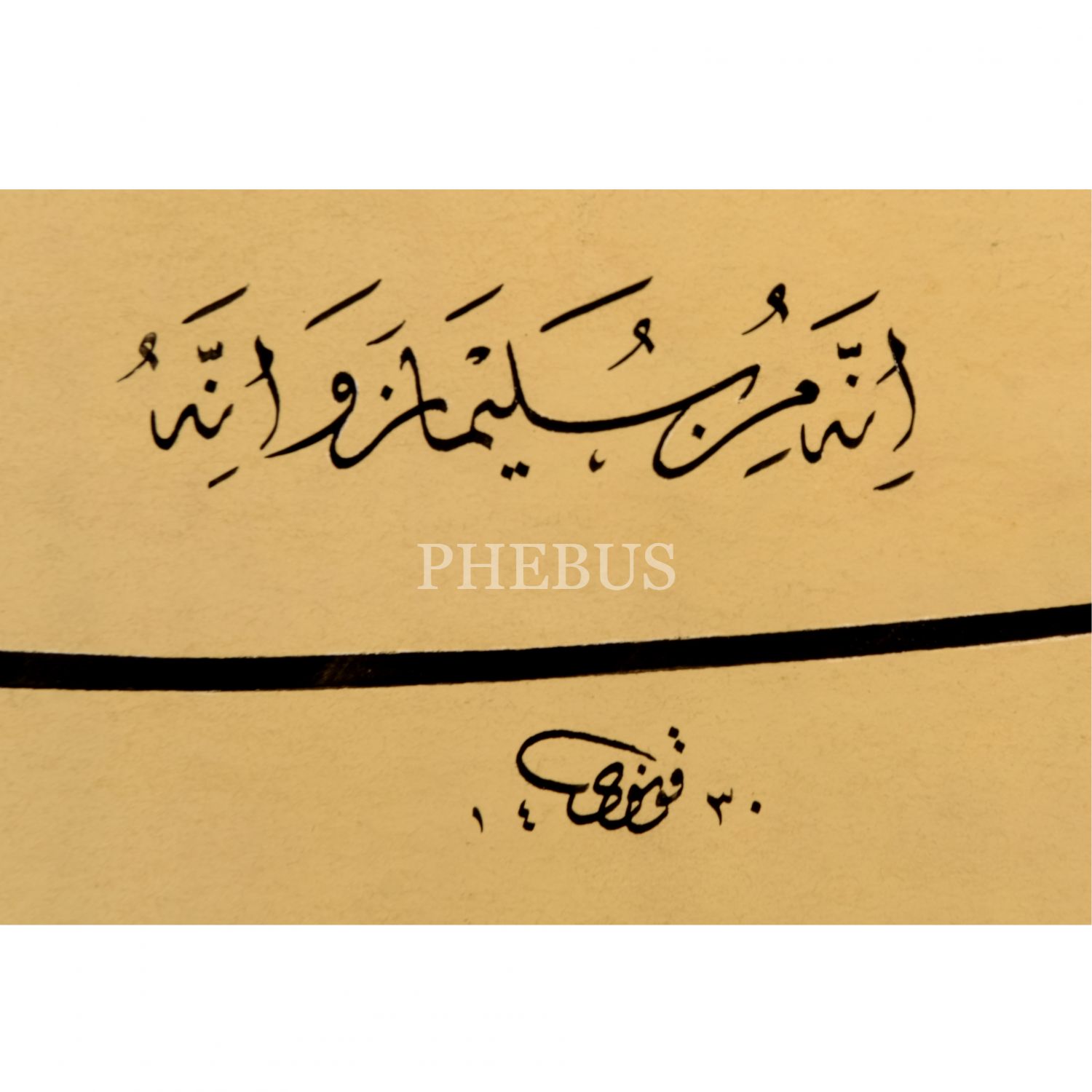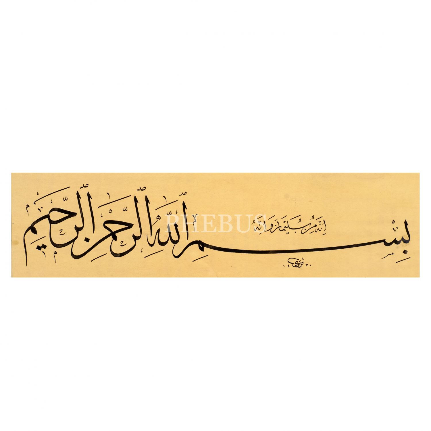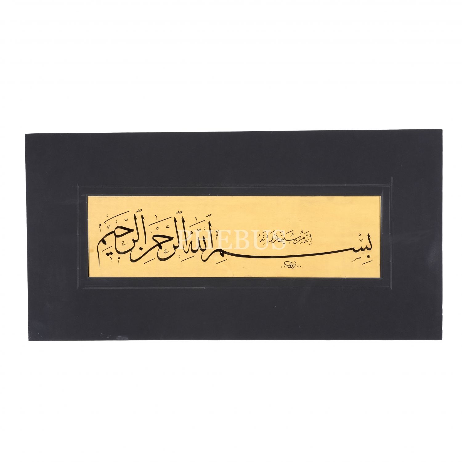 Konevî ketebeli sülüs besmele ve âyet, 1430 tarihli, yazı ölçü: 34x10, paspartu ölçü: 49x25 cm...