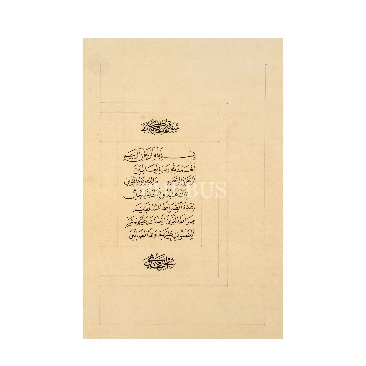 Kur´ân sayfası formunda nesih Fâtiha Suresi, yazı ölçü: 10x14 cm, sayfa ölçü: 14x22 cm, kağıt ölçü: 63x45 cm...