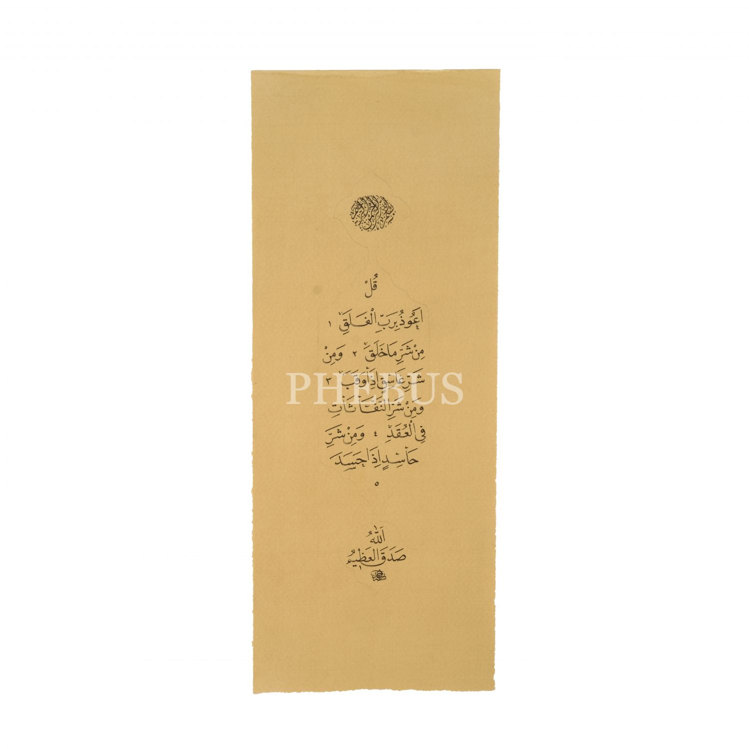 Ahmed ketebeli divanî-nesih Felak Suresi, kağıt ölçü: 14x35 cm...