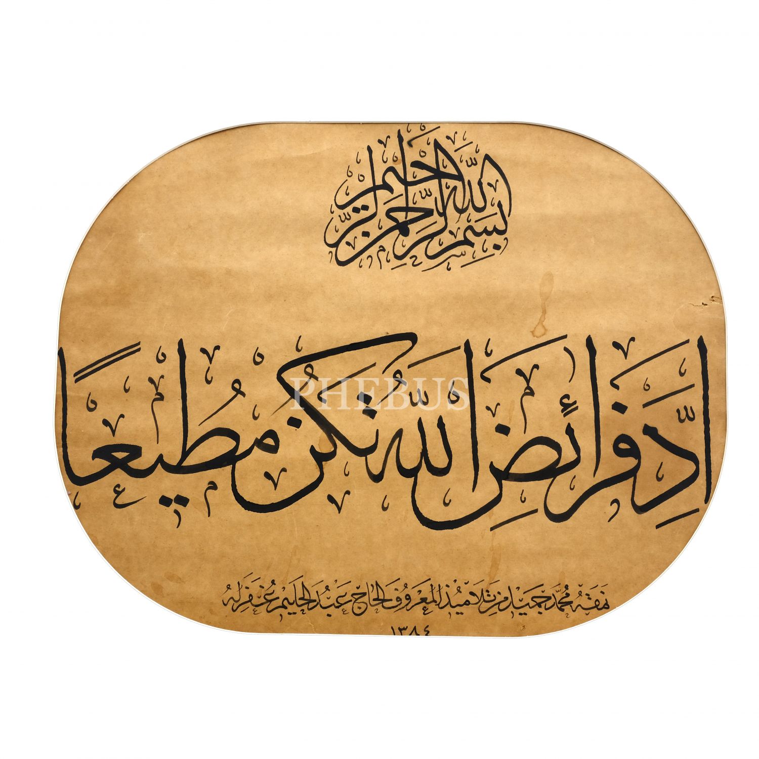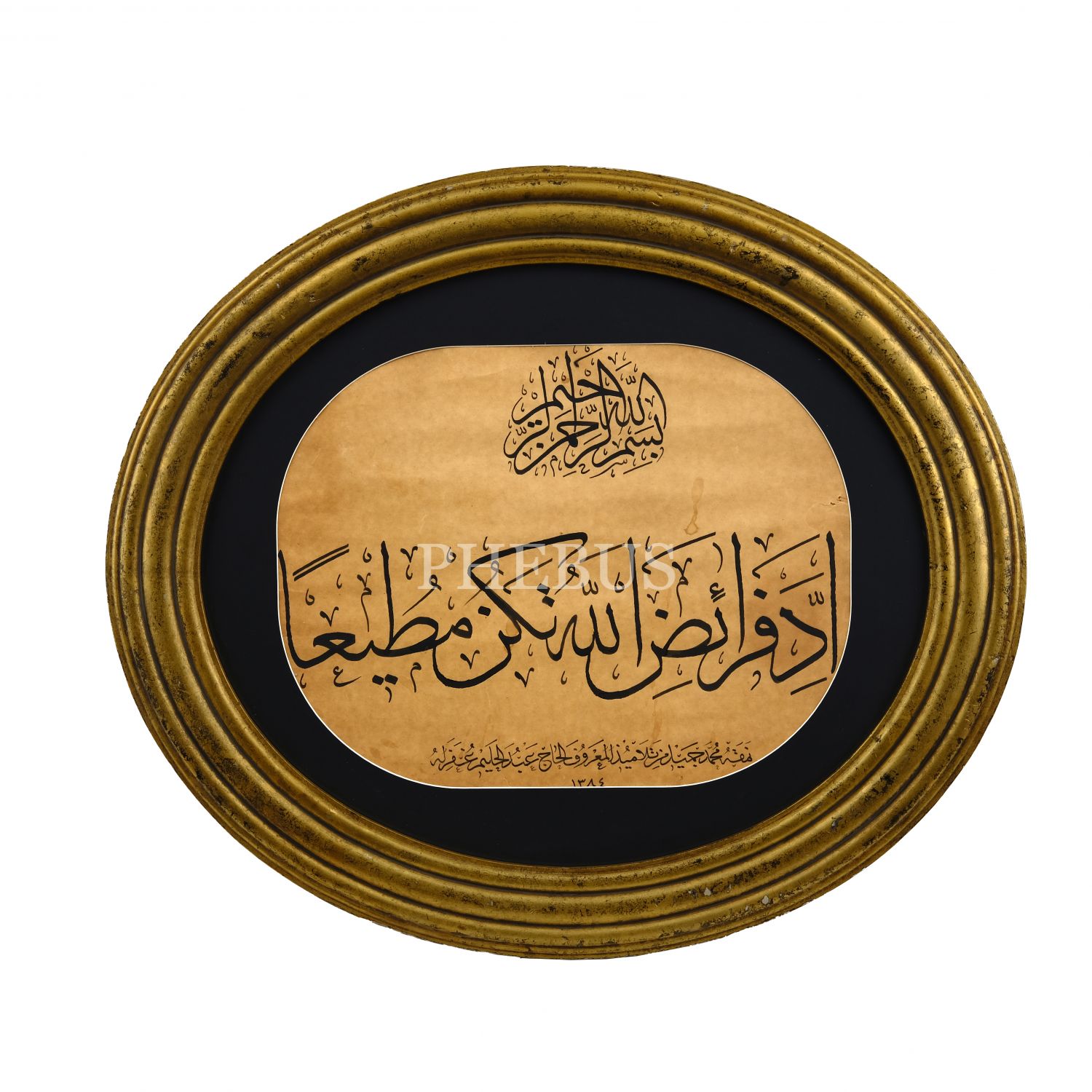 Okunuşu: "Eddi ferâiza´llâhi tekün mutî´an" Anlamı: "Farzları eda et itaatkâr ol"