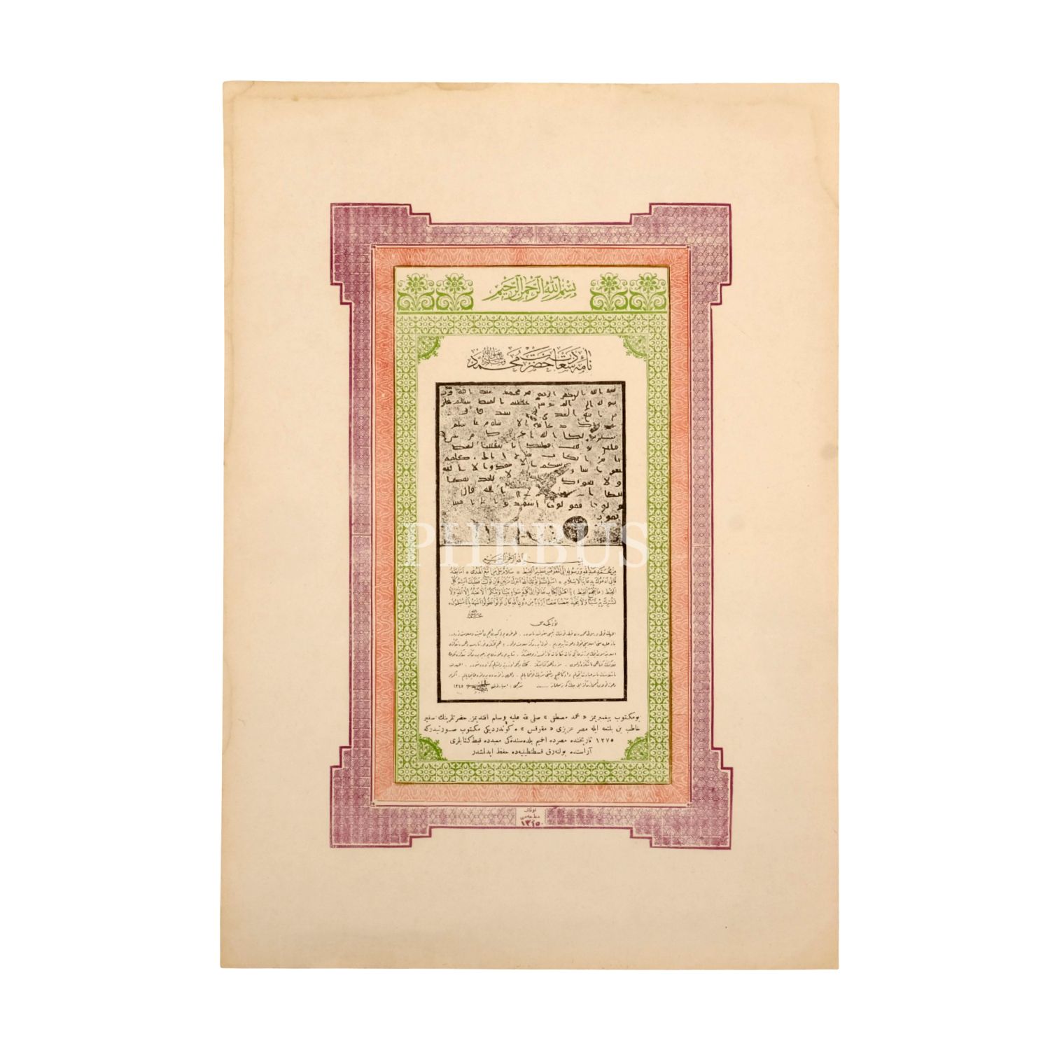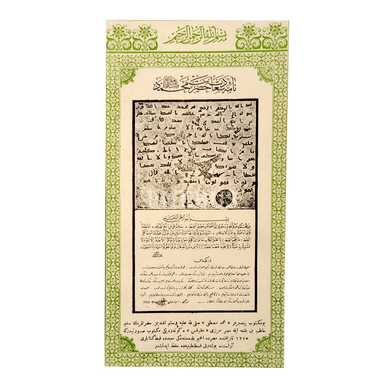 Hazreti Peygamber´in Mısır meliki Mukavkıs´a yolladığı tebliğ mektubunun görüntüsü, Arapça matbu hali ve Türkçe tercümesini içeren broşür, 1345 tarihli, 28x41 cm...
