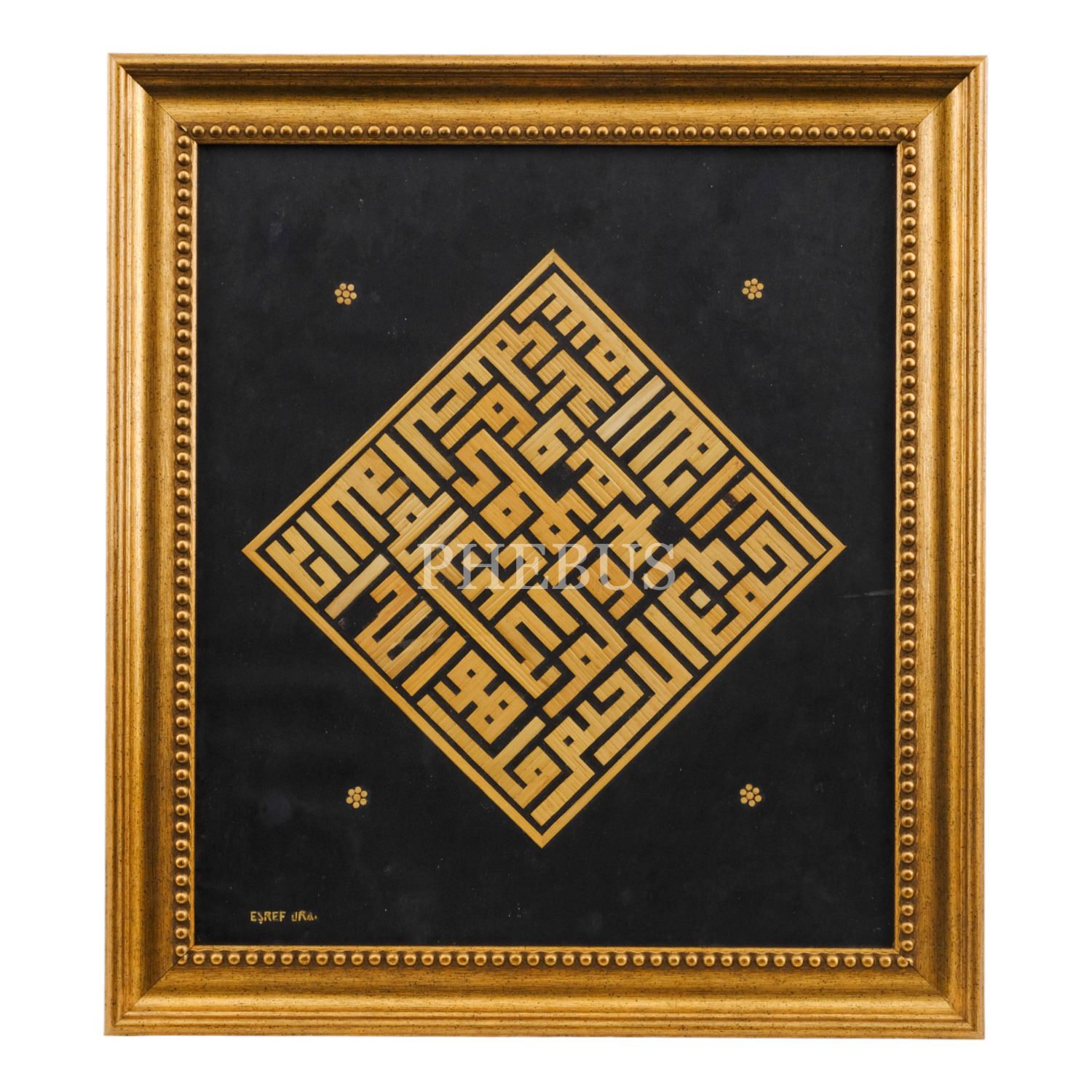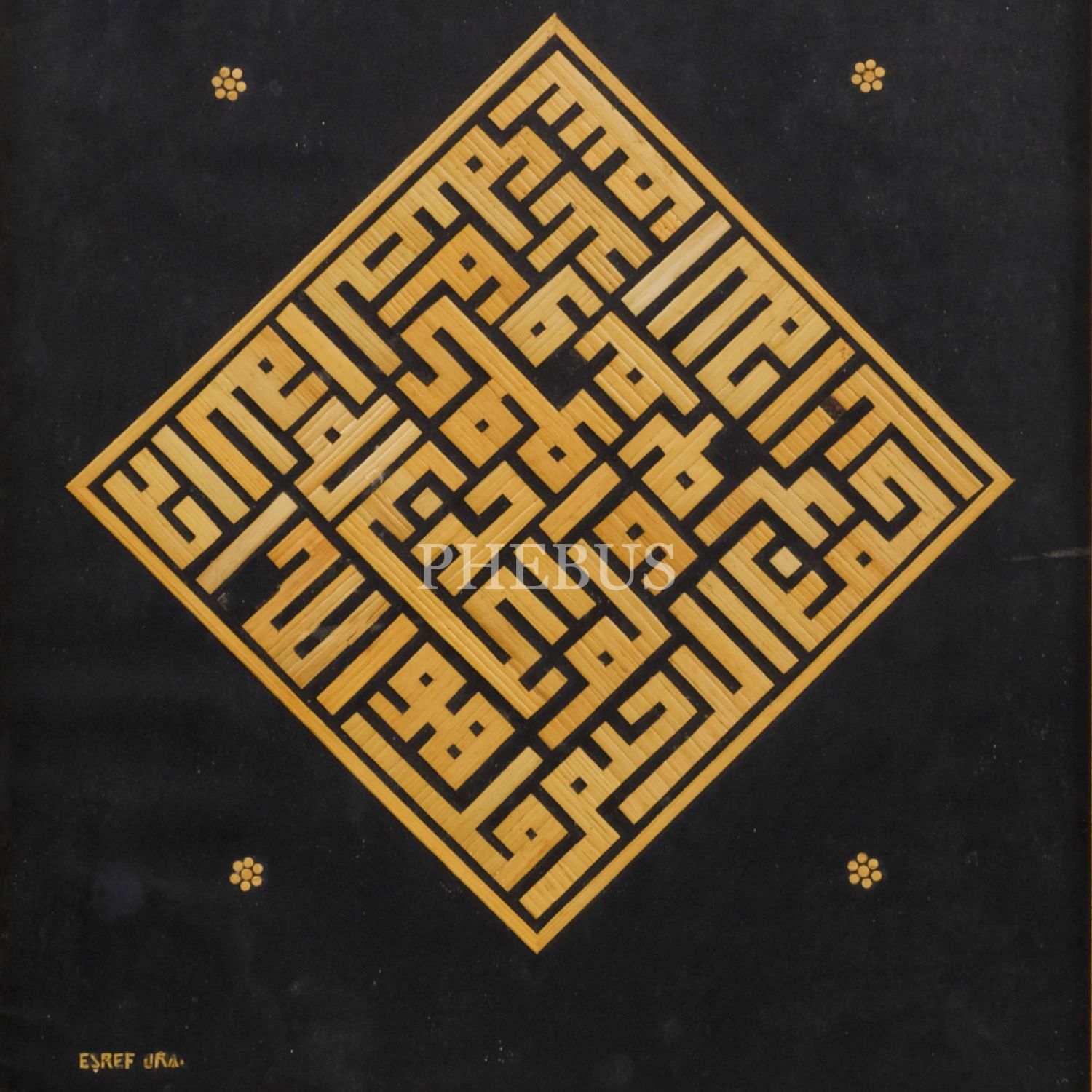 Eşref Ural işi naht tarzı mâkılî istif İhlâs Suresi, yazı ölçü: 26x25 cm, çerçeve içi ölçü: 30x34 cm...