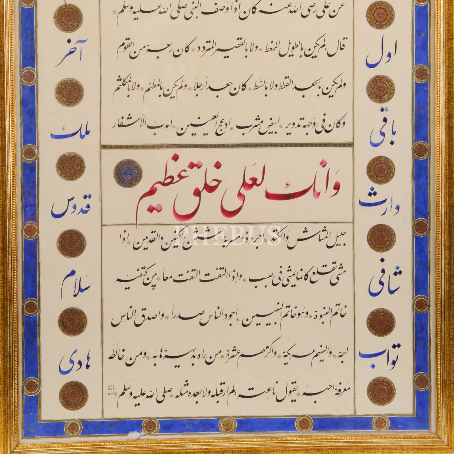 Hadise Bacelan ketebeli, esmâ-i hüsnâ ile çevrili hilye-i şerife, 1443 tarihli, tezhibi Zeynep Ceylan imzalı ve 2022 tarihli, çerçeve içi ölçü: 65x90 cm...