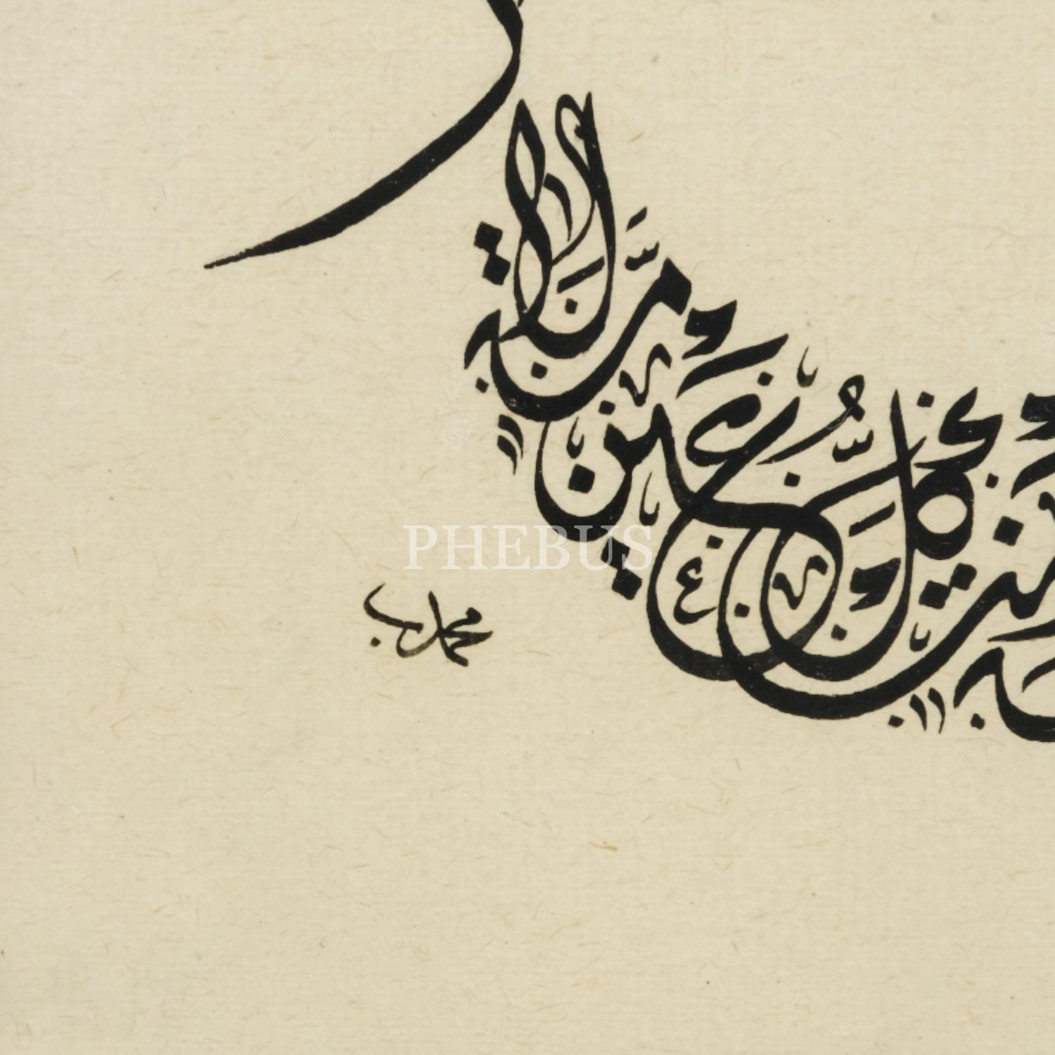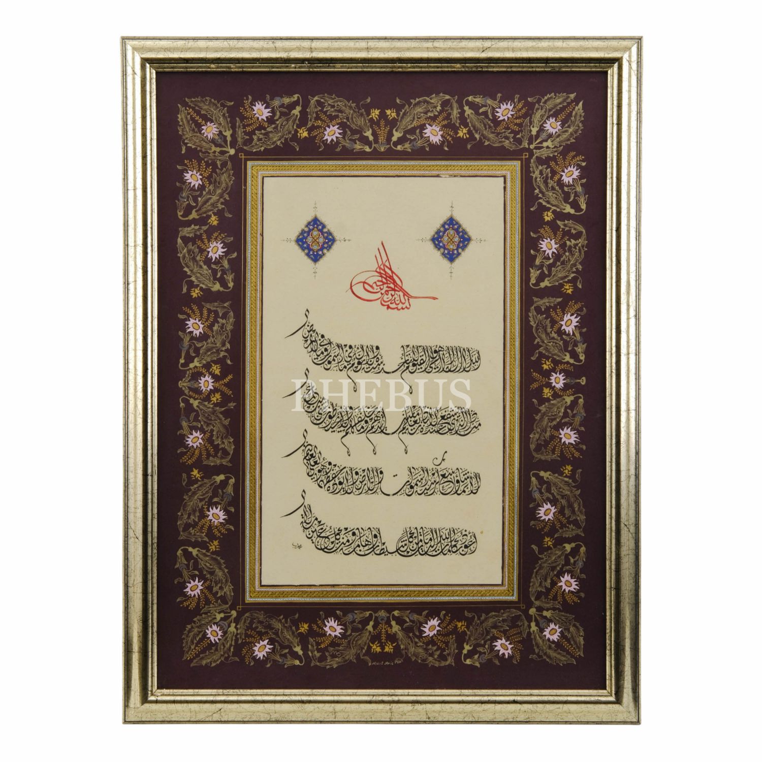 Mehmed B. ketebeli celî divanî âyetelkürsî, tezhibi Nedret Meriç imzalı ve 2003 tarihli, yazı ölçü: 29x49 cm, çerçeve içi ölçü: 53x74 cm...