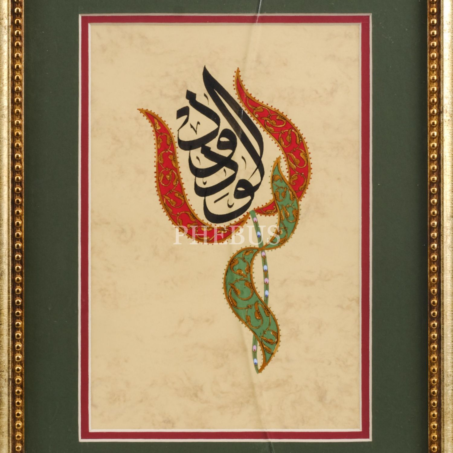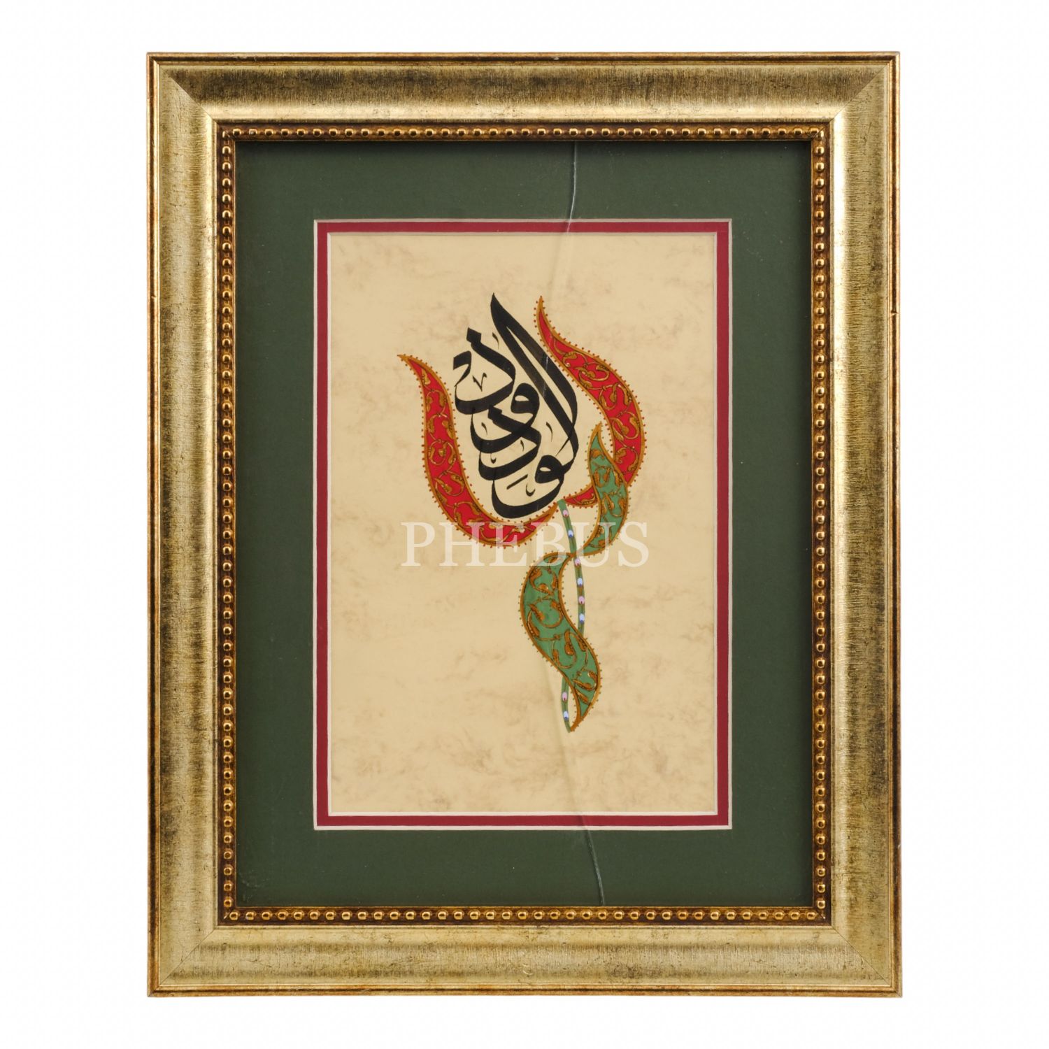 Lale formunda tezhibiyle celî divânî levha, yazı ölçü: 20x30 cm, çerçeve içi ölçü: 30x40 cm...