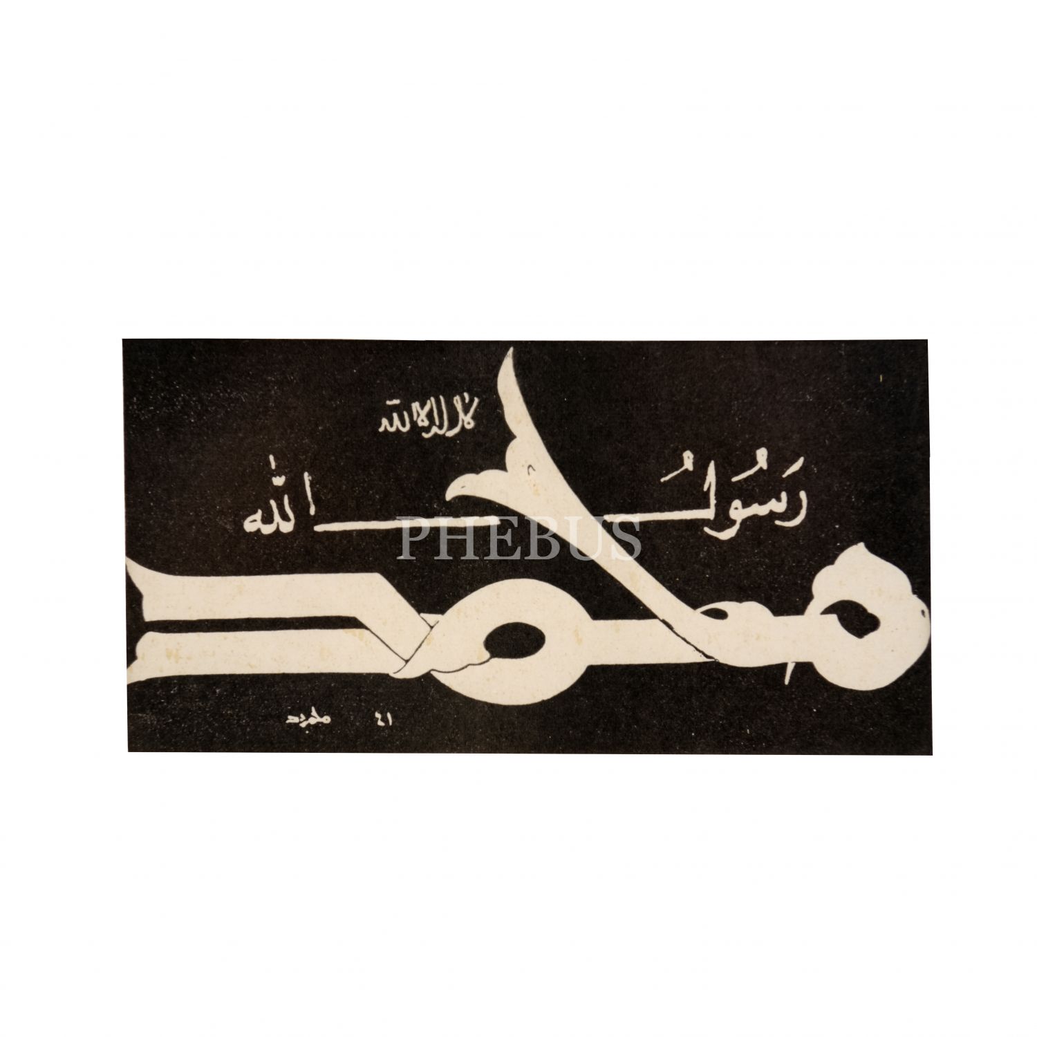 Mahmud ketebeli baskı kûfî kelime-i tevhid, yazı ölçü: 12x7 cm, çerçeve içi ölçü: 17x11 cm...
