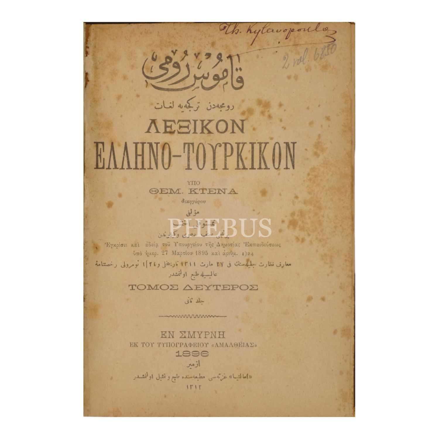 KÂMÛS-İ RÛMÎ, RUMCADAN TÜRKÇEYE LUGAT / LEXIKON ELLENO-TURKIKON, 2 cilt tam takım, Temistokli Ahtena, 1896, Amalteya Matbaası, İzmir, 86 sayfa, 15x21 cm...