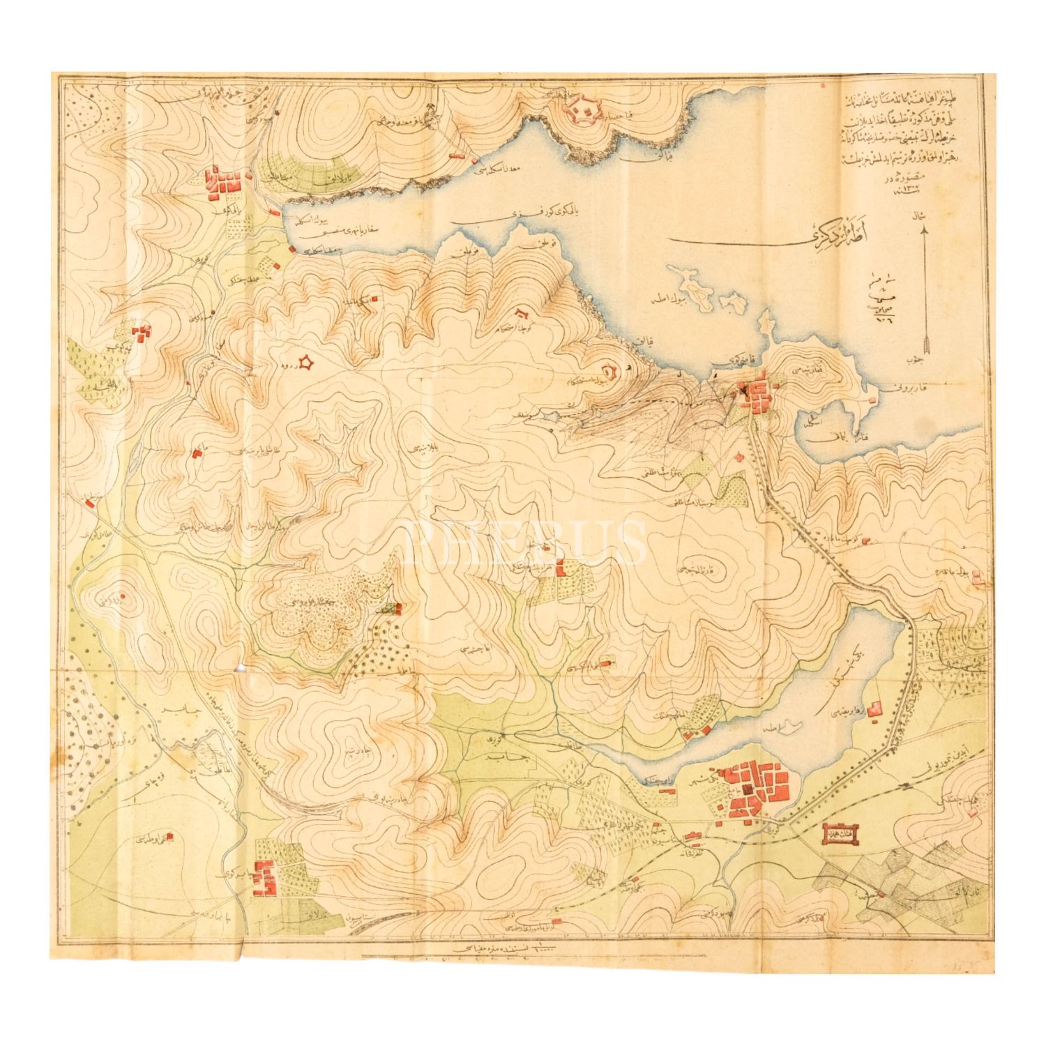 Mükâfat cildinde. 1 adet katlanır haritalı ve çizimlerle desteklenmiş Osmanlıca topoğrafya kitabı.