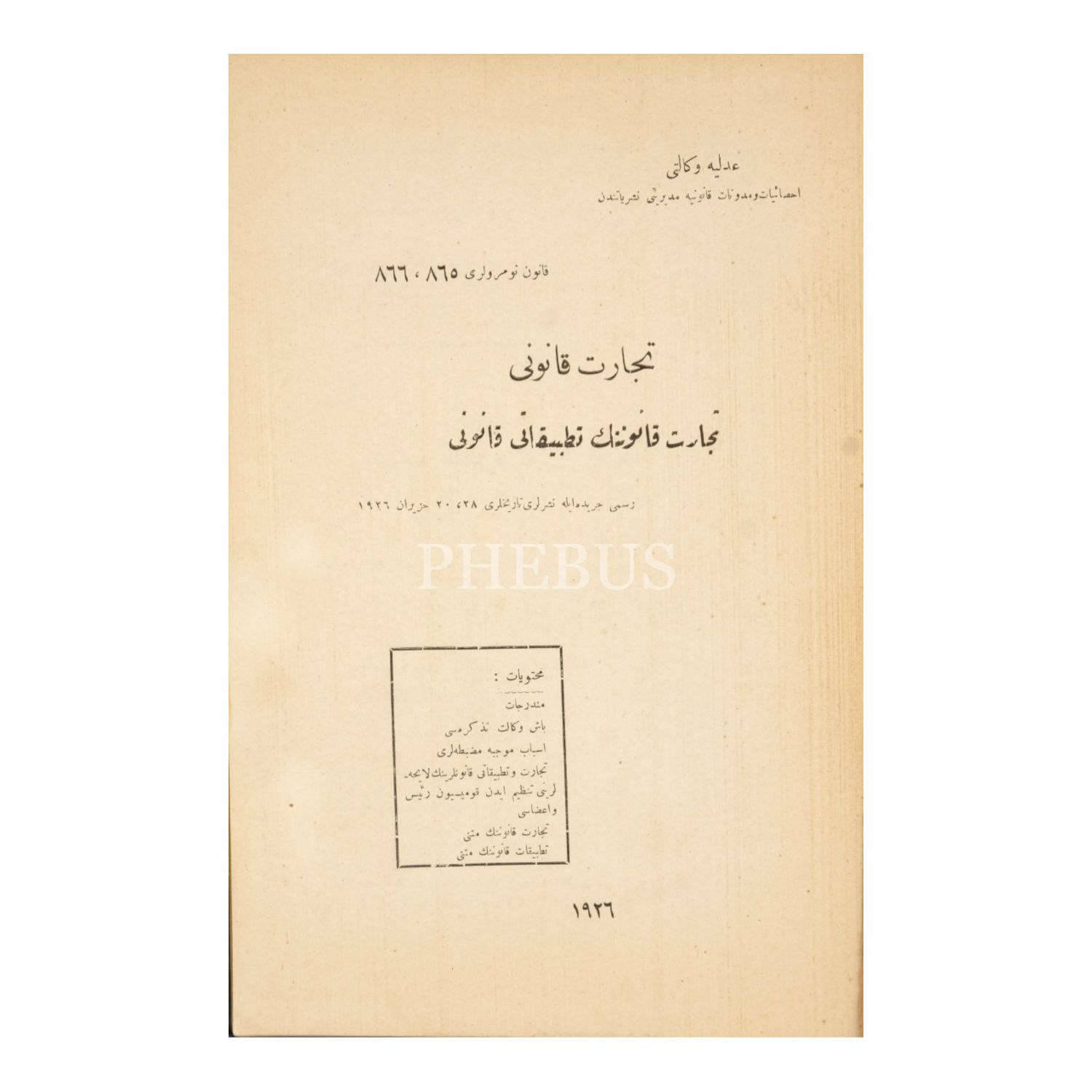 TİCÂRET KÂNÛNU, TİCÂRET KÂNÛNUNUN TATBÎKÂTI KÂNÛNU, 1926, 186 sayfa, 20x27 cm...