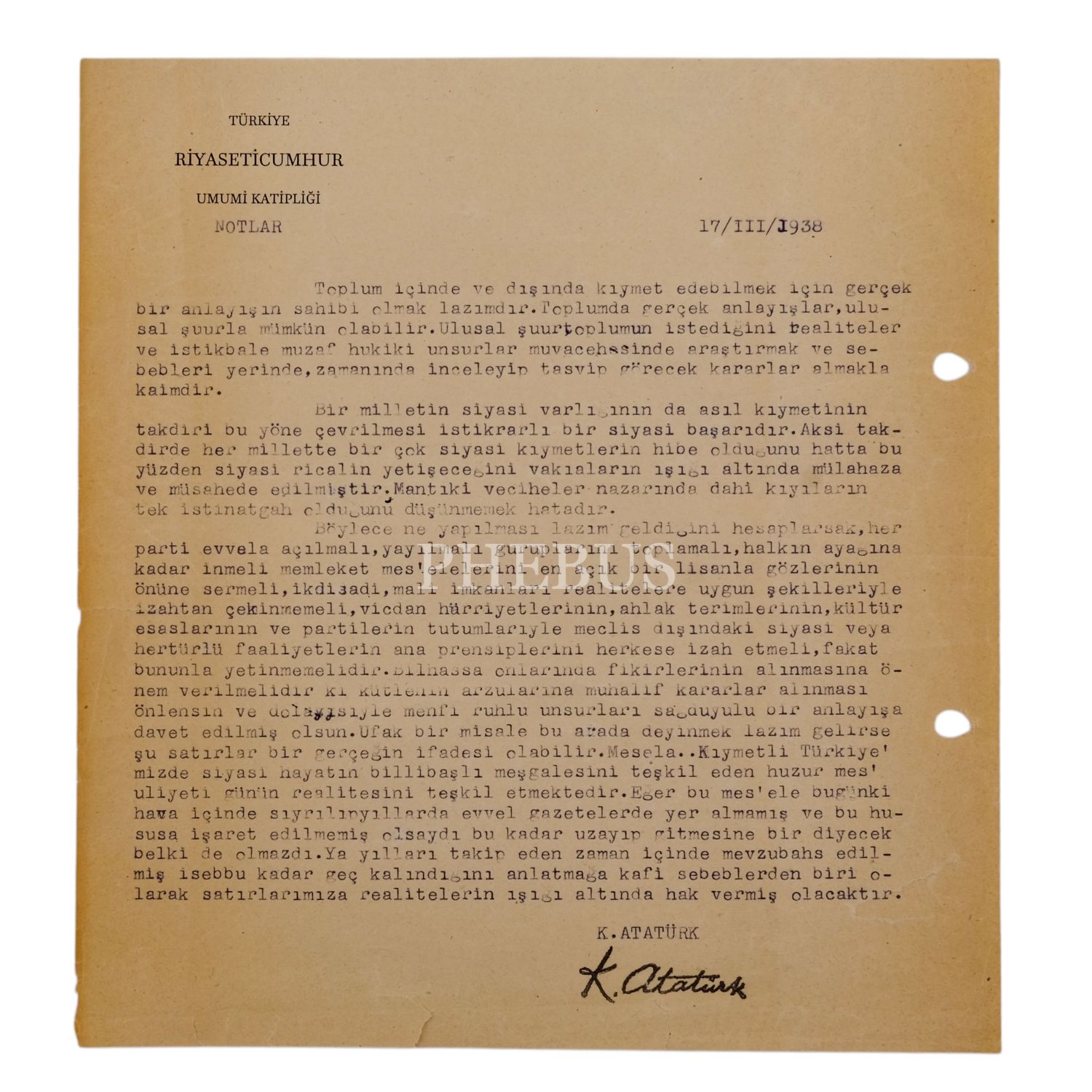 "Türkiye Riyaseticumhur Umumi Katipliği (Özel)" antetli kâğıda 17 Mart 1938 tarihinde daktiloyla geçirilmiş, Mustafa Kemal Atatürk vecizesi, 20x22 cm...