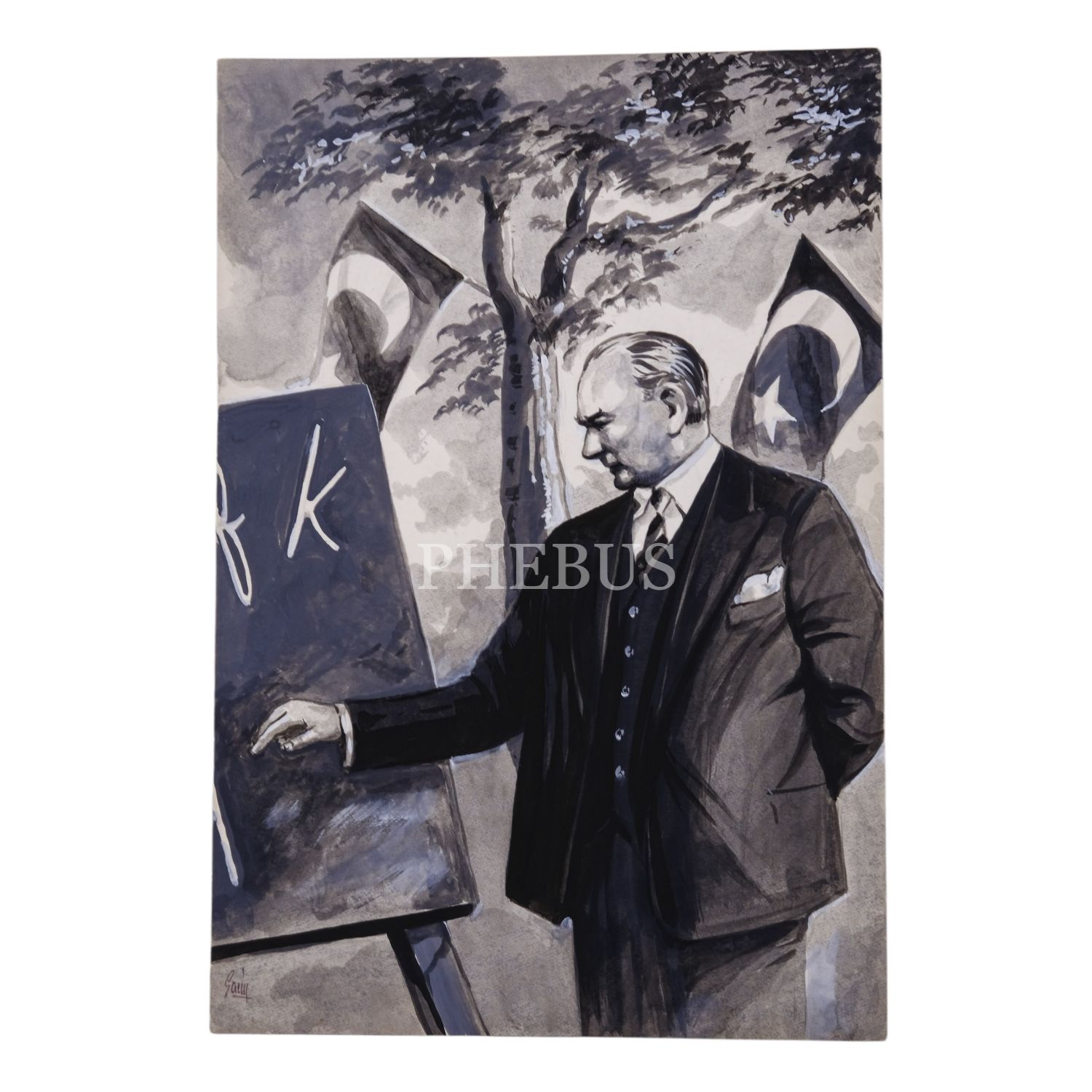 Ressam Saim Onan´dan ıslak imzalı, orijinal Mustafa Kemal Atatürk çizimi, 22x31 cm...