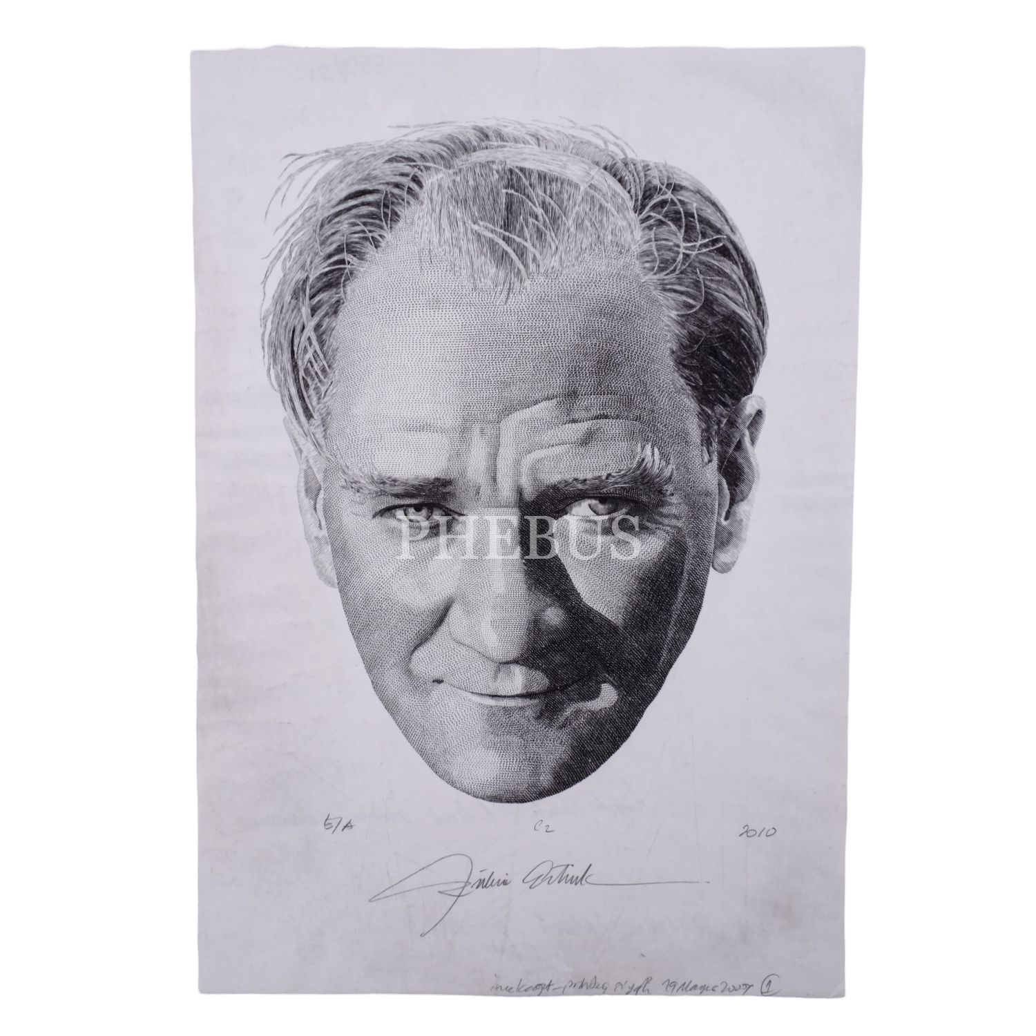 Kağıt paraların üzerindeki Atatürk portrelerinin çizeri Şükrü Ertürk´ten imzalı, gravür baskı Mustafa Kemal Atatürk portresi, 2010, 21x30 cm...