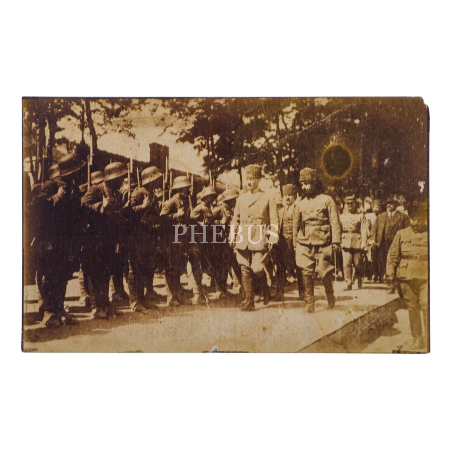 Mustafa Kemal Atatürk ve İsmet İnönü, Eskişehir´de, kendilerini tren istasyonunda karşılayan tören birliğini denetliyor, arkada Ankara Antlaşması görüşmeleri için Türkiye´ye gelen Henry Franklin-Bouillon görülmektedir, 6 Haziran 1921, 13x8 cm...