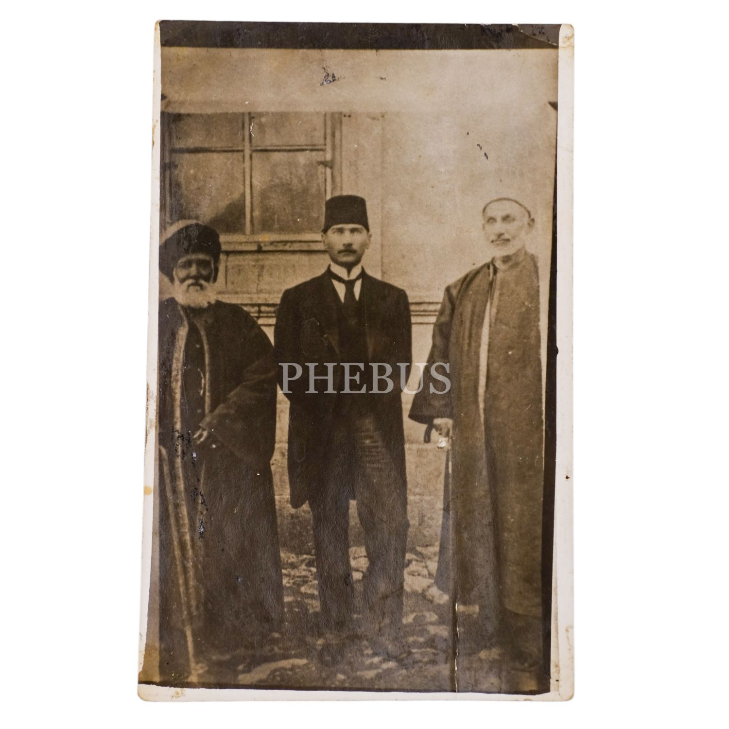 Mustafa Kemal Atatürk, Sivas Kongresi günlerinde, Milli Mücadele´ye büyük desteklerde bulunan Sivas Kadısı Hasbi ve Erzincanlı Şeyh Fevzi Efendilerle birlikte, 4-11 Eylül 1919, 9x14 cm...