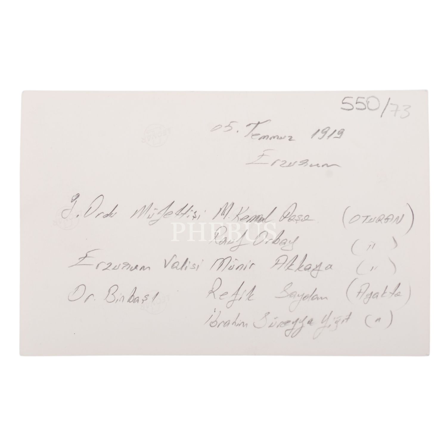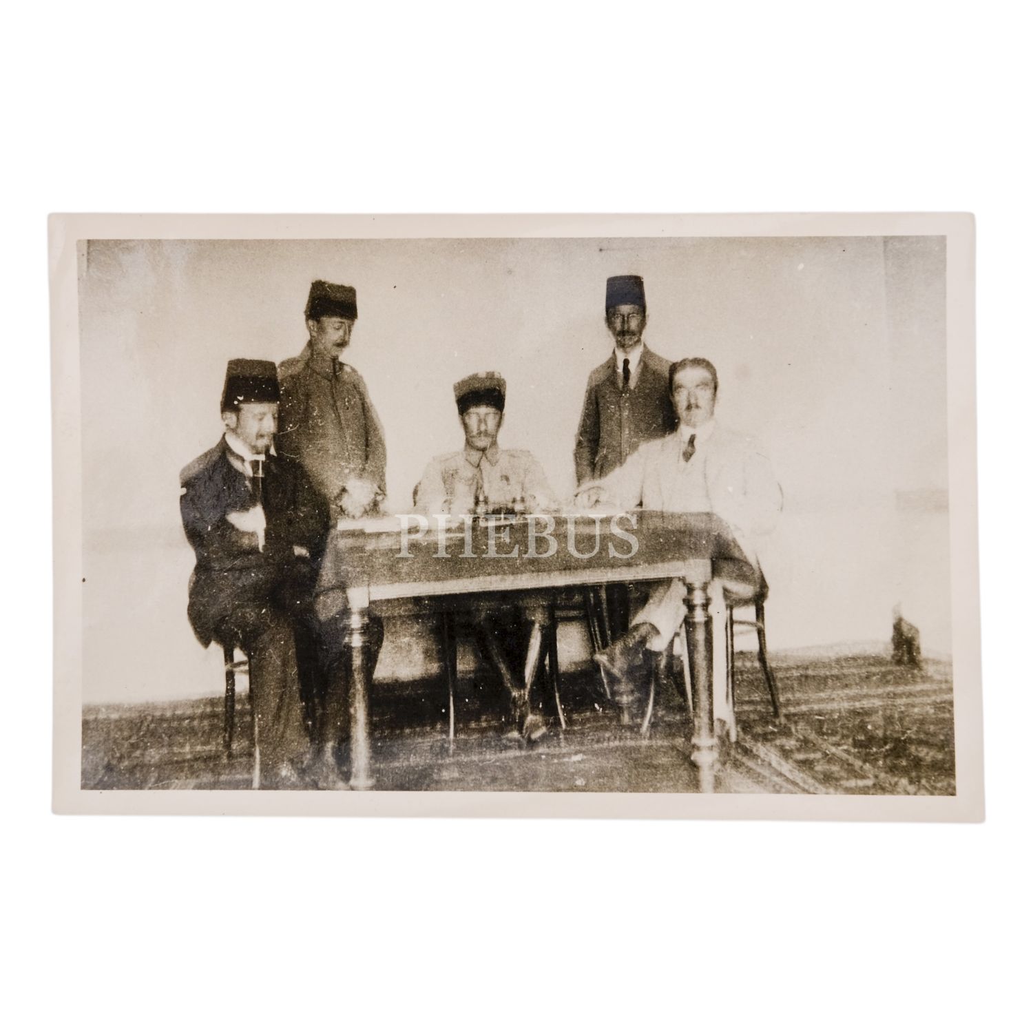 Mustafa Kemal Atatürk, Erzurum Kongresi hazırlıklarını yapmak üzere Hüseyin Rauf Orbay, Refik Saydam, İbrahim Süreyya Yiğit ve Erzurum Valisi Münir Akkaya ile birlikte toplantı halinde, 5 Temmuz 1919, 15x10 cm...