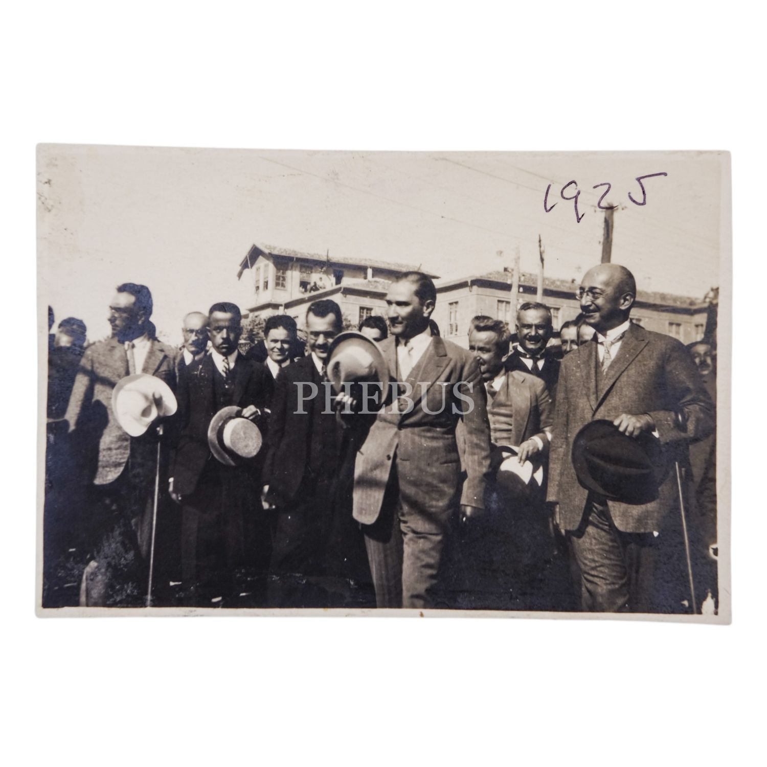 Mustafa Kemal Atatürk, Kastamonu ve İnebolu´ya yaptığı ve şapkayı halka tanıttığı seyahat sonrası Ankara´da, kendisini karşılamaya gelen şapka giymiş toplulukla beraber, 1 Eylül 1925, 10x6 cm...