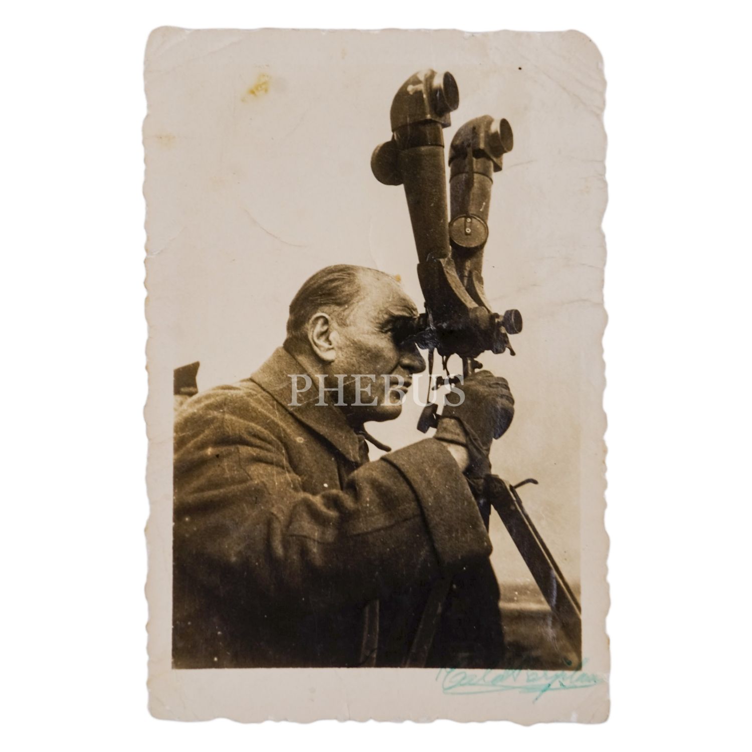 Mustafa Kemal Atatürk, İstanbul Metris´te, batarya dürbünü ile Harp Akademileri Tatbikatları´nı izliyor, 28 Mayıs 1936, 6x9 cm...