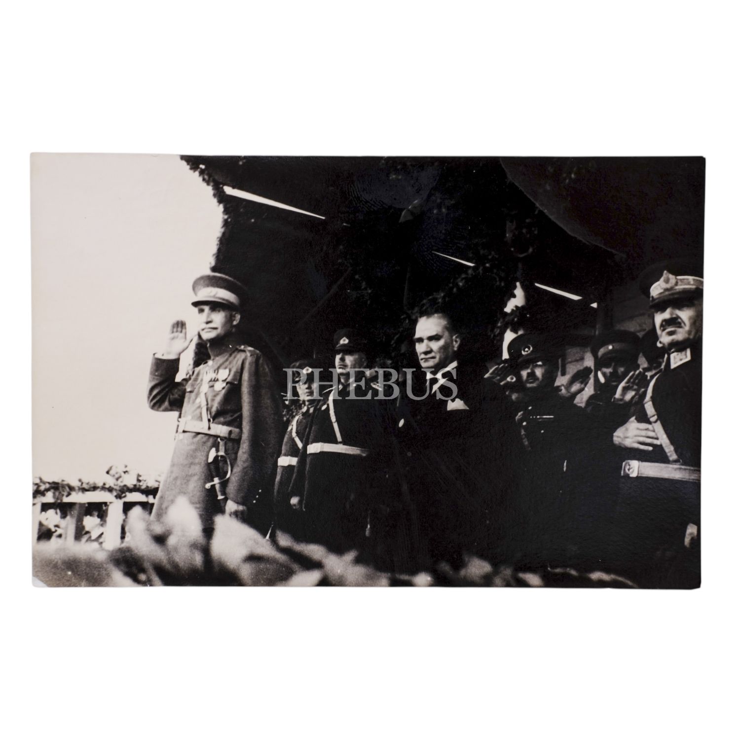 Mustafa Kemal Atatürk, Türkiye´yi ziyaret eden İran Şahı Rıza Pehlevi ile birlikte, Ankara Hipodrom´da düzenlenen töreni takip ediyor, 17 Haziran 1934, 14x9 cm...