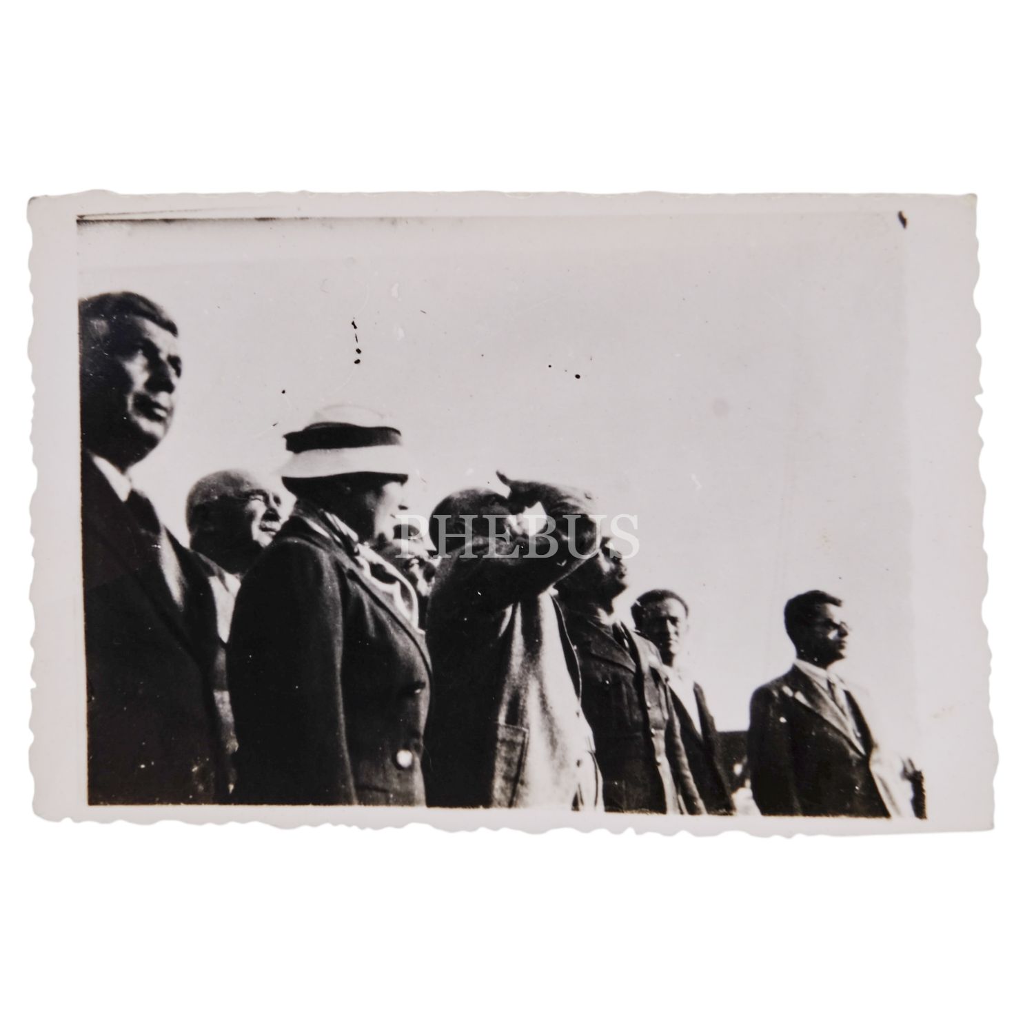 Mustafa Kemal Atatürk, Afet İnan ve Ali Çetinkaya ile birlikte Yeşilköy Havaalanı´nda, bir uçağın uçuşunu seyrediyor, 29 Eylül 1937, 9x6 cm...