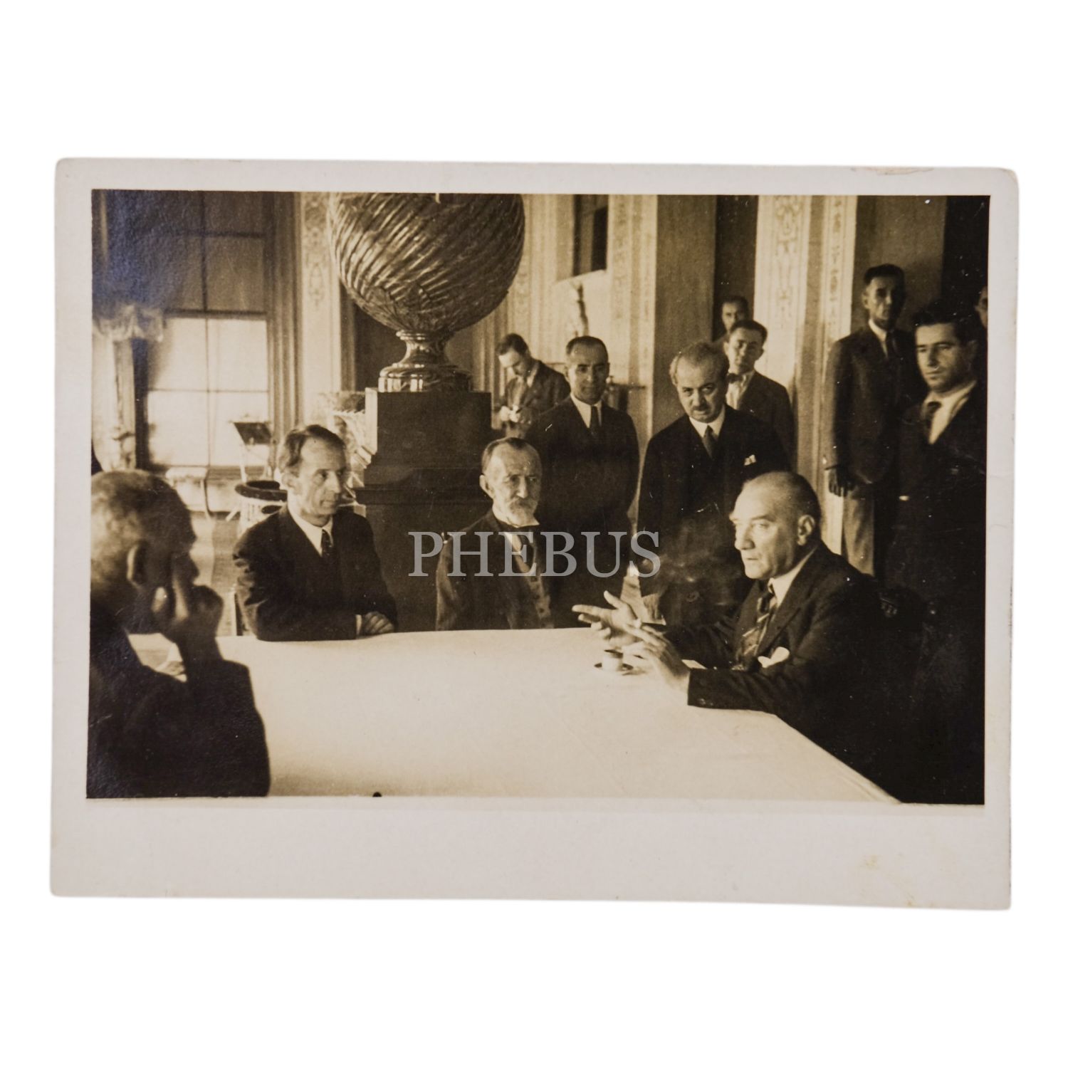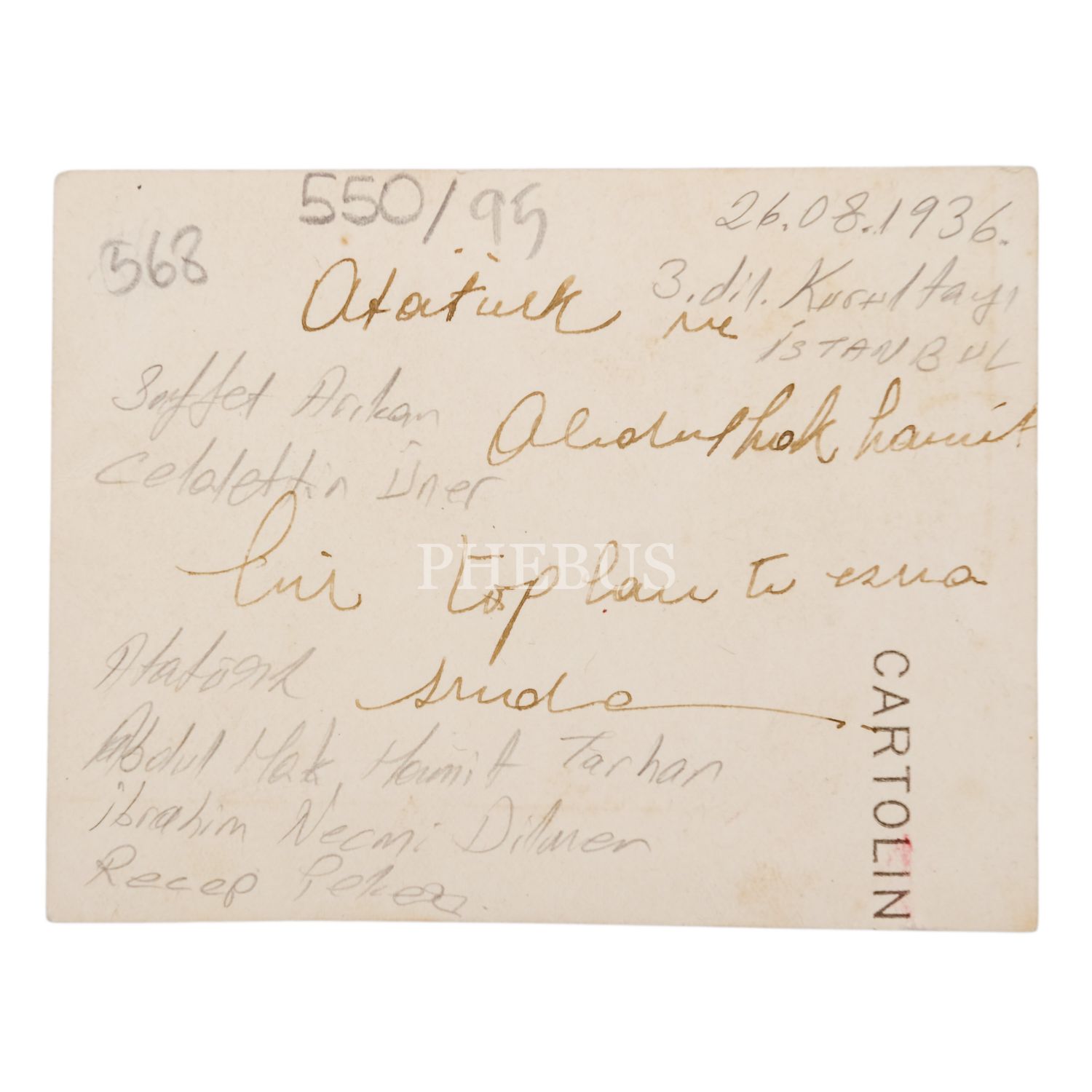 Mustafa Kemal Atatürk, "Şair-i Âzam" Abdülhak Hamit Tarhan, İbrahim Necmi Dilmen, Recep Peker, Saffet Arıkan ve Celalettin Üner ile birlikte III. Dil Kurultayı´nda, 26 Ağustos 1936, 9x7 cm...